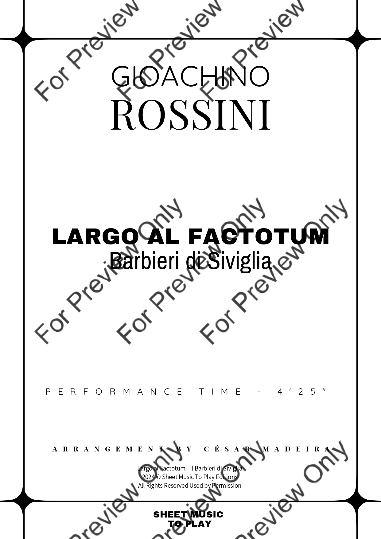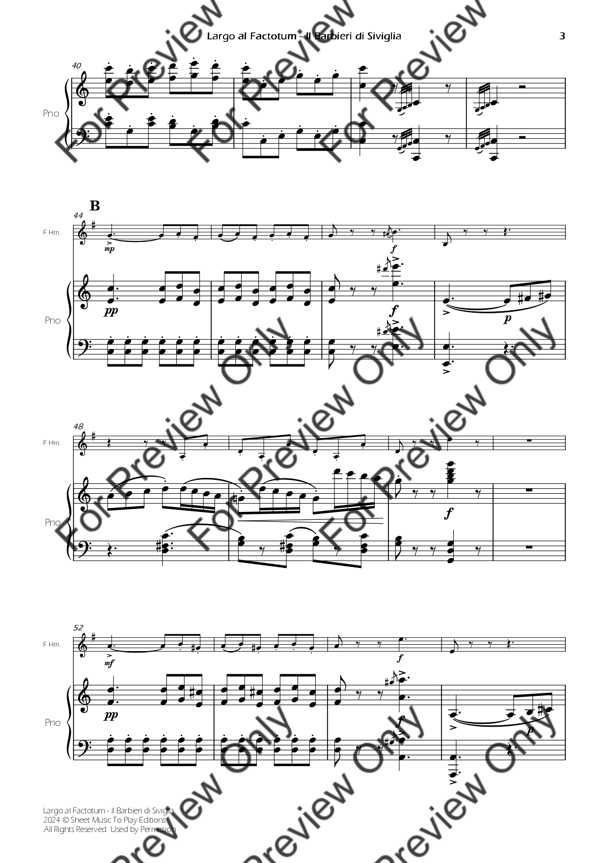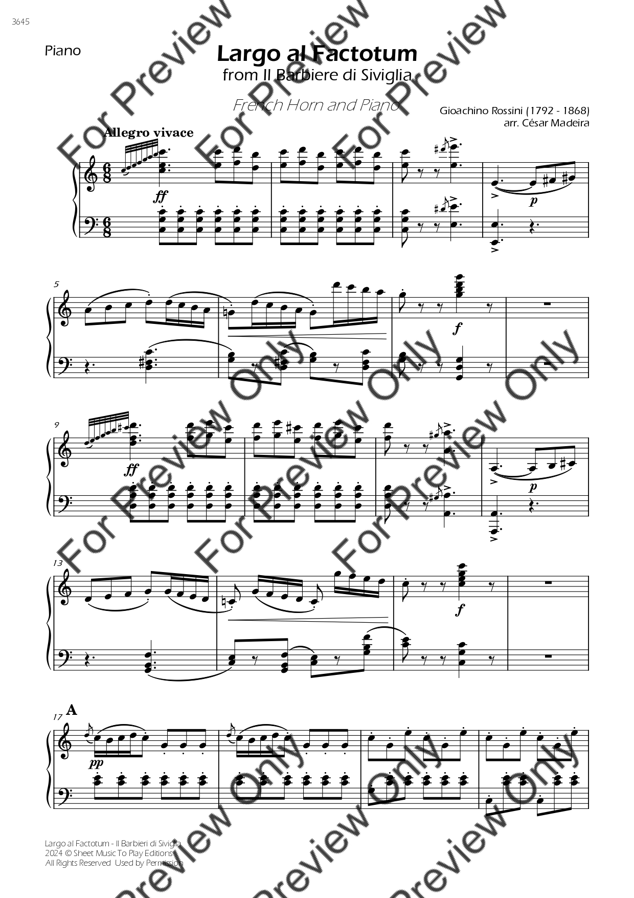 Largo Al Factotum from Il Barbiere di Siviglia by Gioachino Rossini. Arrangement for French Horn and Piano. With Full Score and Individual Parts. Have fun!
