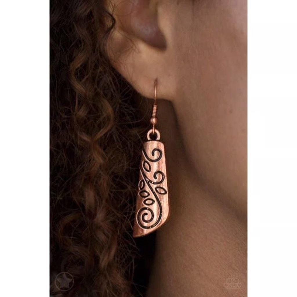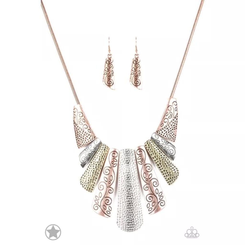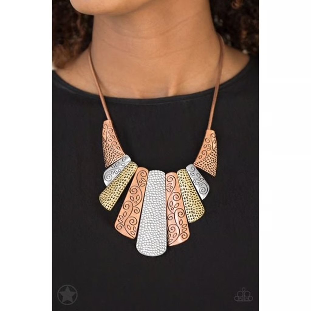 Introducing the Untamed Copper Necklace-Blockbuster-Paparazzi. This statement necklace is crafted with a mixed metal, hammered texture and filigree texture for a unique tribal design. Embrace your inner style with this eye-catching piece.