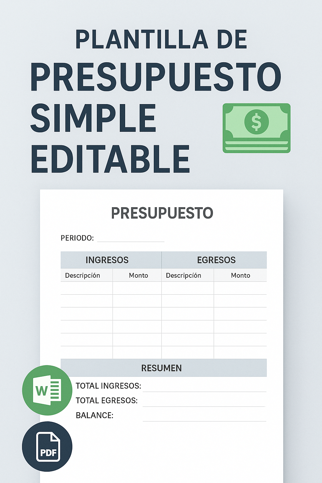 Organizá tus gastos e ingresos de manera clara y profesional con esta Plantilla de Presupuesto Simple, lista para usar en Microsoft Word o imprimir en PDF.