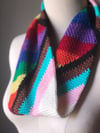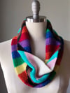 This cowl is an infinity tube (aka doughnut or torus) formed by joining four squares together. The first two squares are worked separately in rainbow stripes, from one corner to the other, on the bias. The third and fourth squares are worked modularly by picking up stitches from the rainbow squares and working mitered squares inward with decreases at each corner.