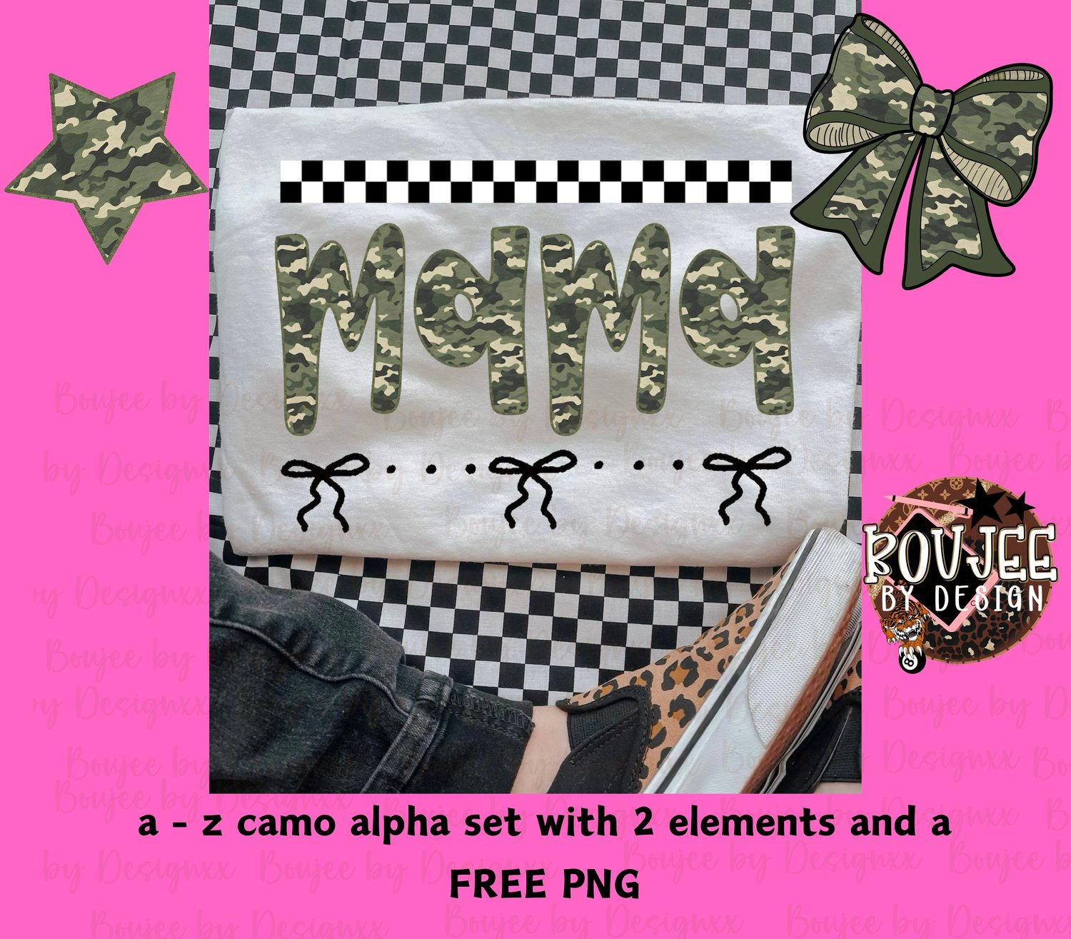 A–Z Camo Alpha Set | Hand-Drawn Letters | 2 Bonus Elements + Free PNG | Sublimation & DTF Clipart