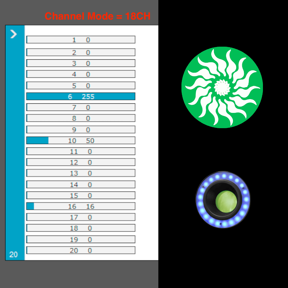 - Realizada para el modo de 18CH, con los Gobos y Colores propios del equipo.