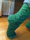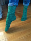 Ebla socks are top-down with twist stitch stars in a diamond and hexagon latice, heel flap, round heel, gussets, twist stitch instep and short toe. Lattices in the round have the same problem as stripes that jog, but there are notes in the written instructions for dealing with that.