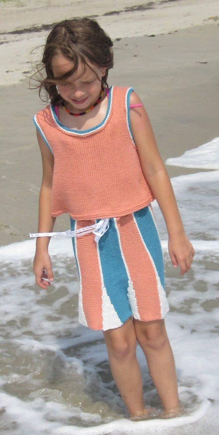 This linen/cotton tank top evokes thoughts of wide sandy beaches along a foamy sea. The shirt is a straightforward knit, with picked up garter stitch trim at the neckline and armholes that echoes the colors in the more glamorous skirt. With extra deep armholes and a generous scoop neck, this linen/cotton top is sure to be a favorite even in the heat of summer.