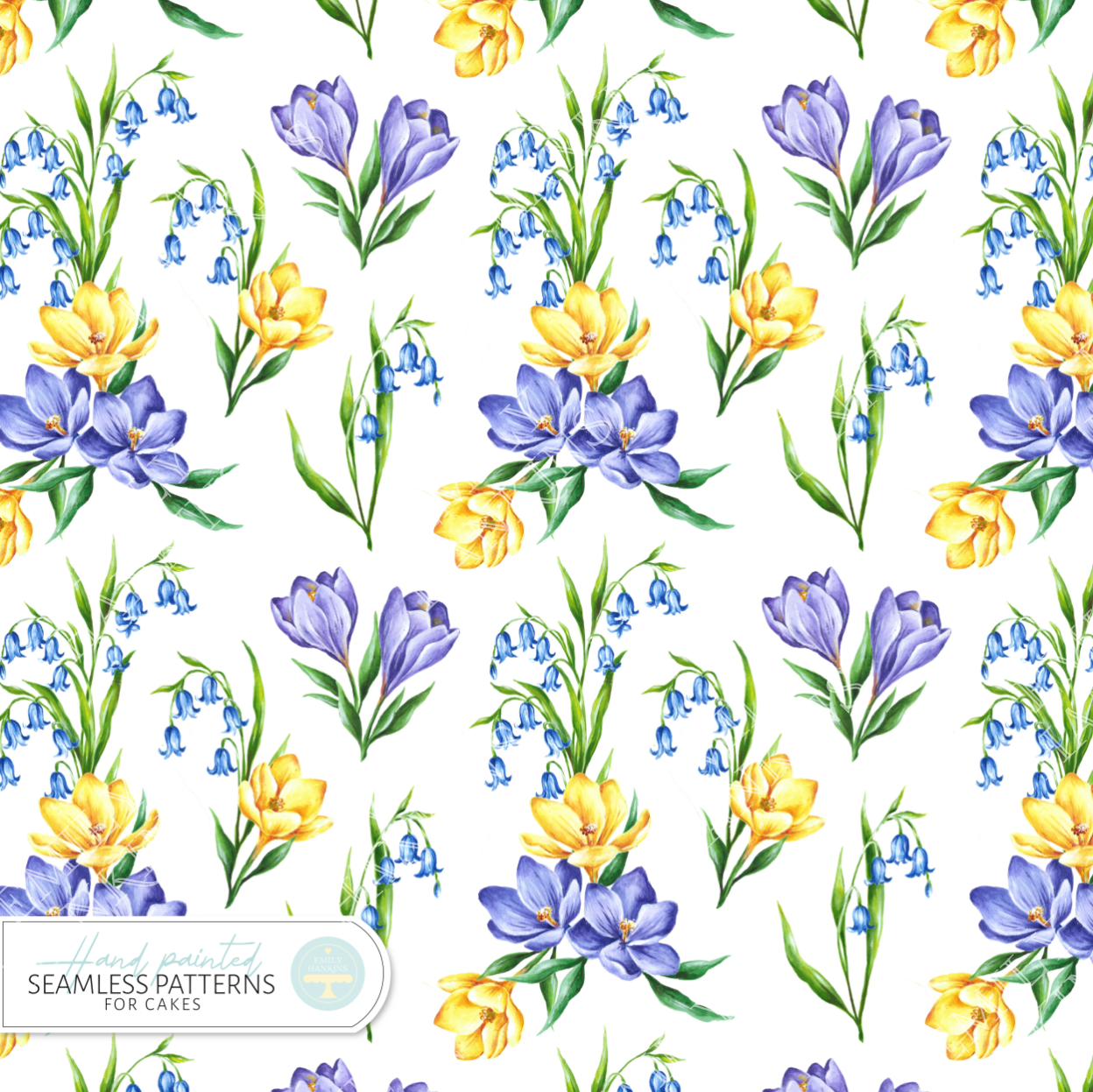 The design is inspired by early spring flowers and features bluebells and crocuses on a plain white background. Each flower has been hand painted by Emily and painstakingly crafted into a seamless pattern for your cake designs.