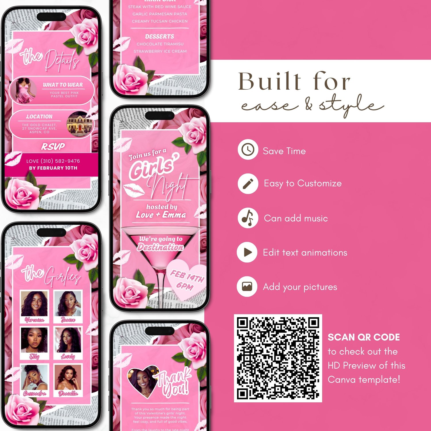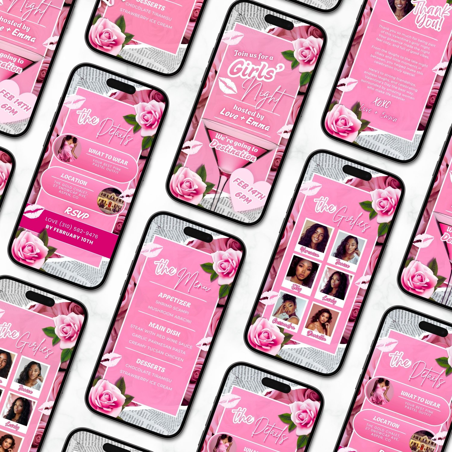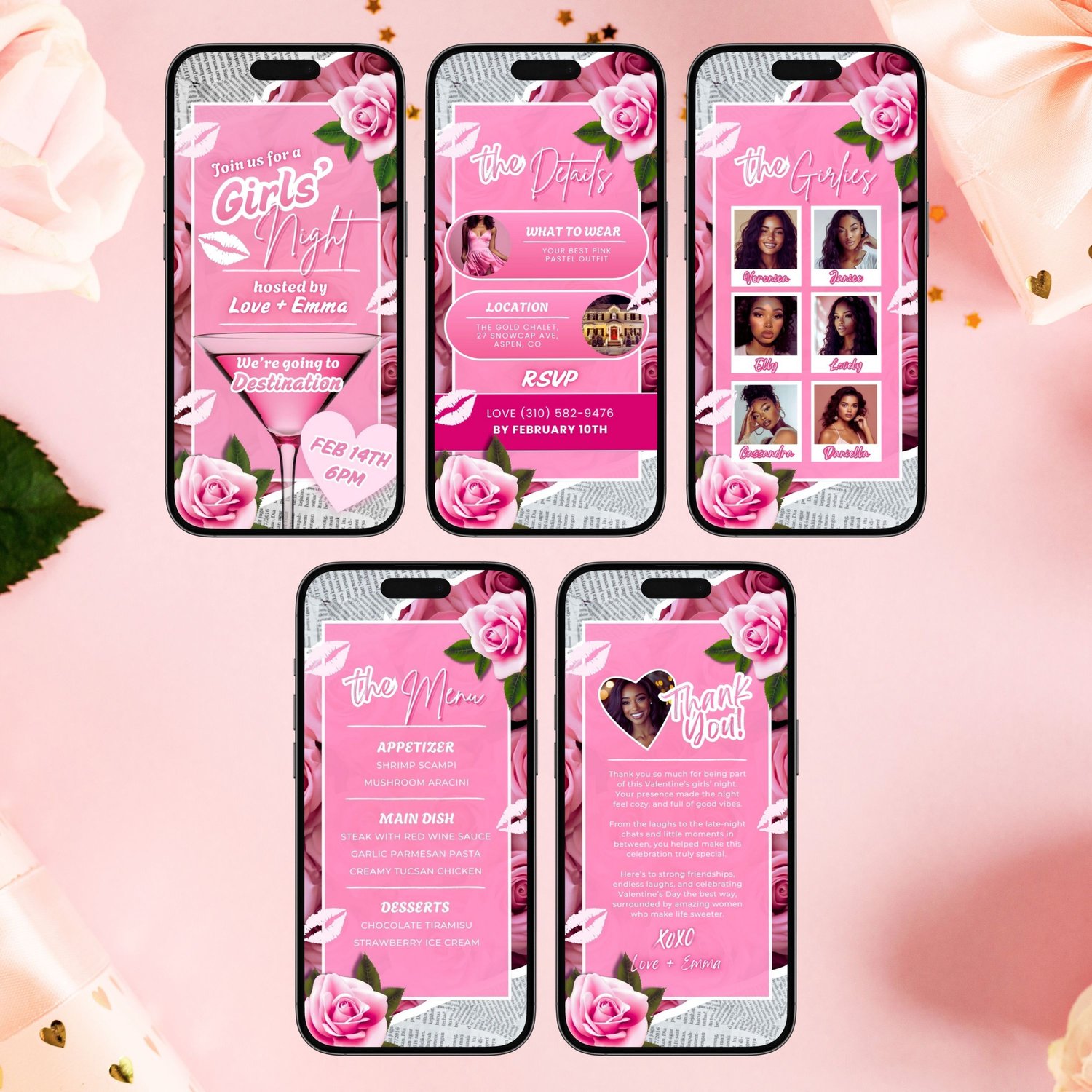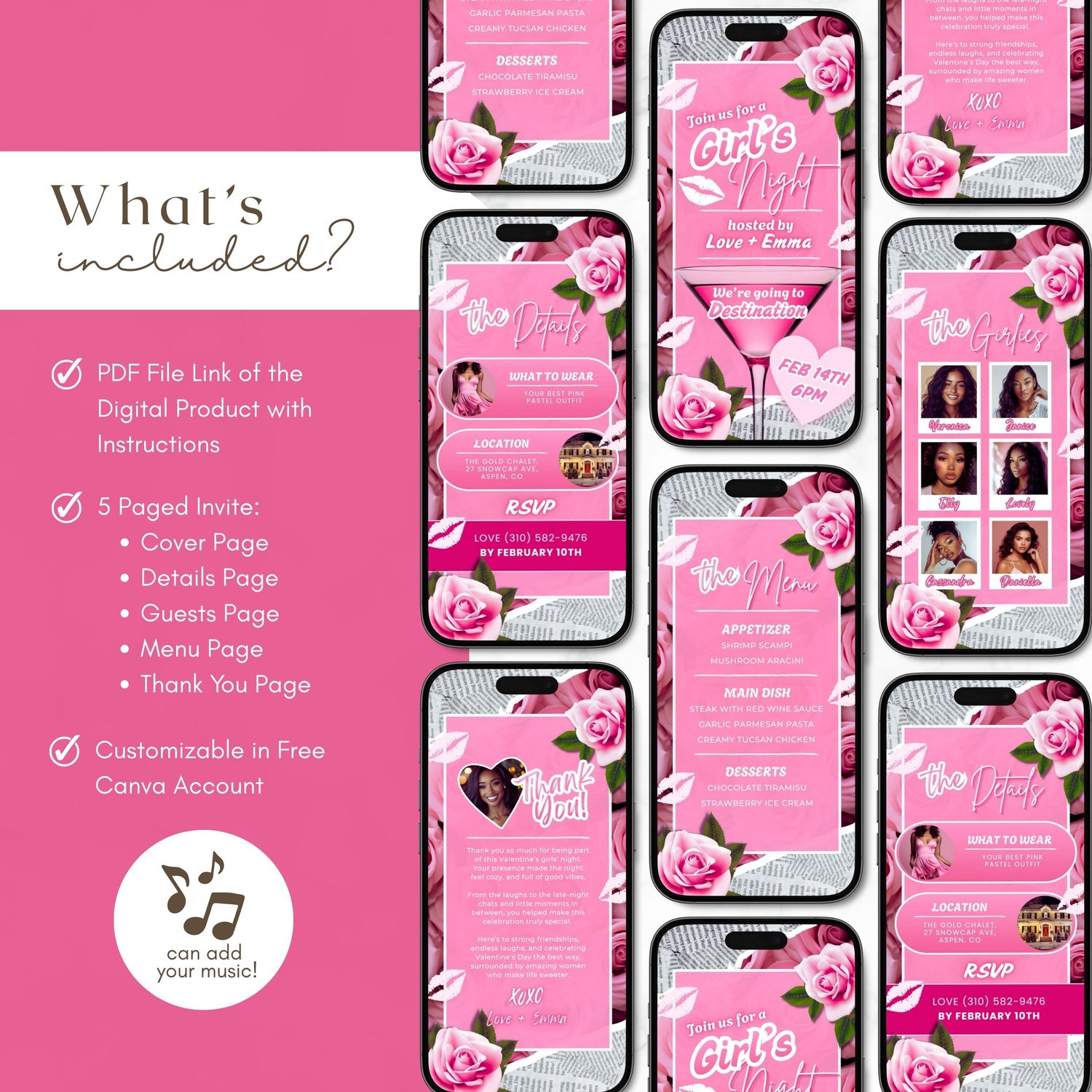 Valentines Girls Night Video Invite, Pink Rose Galentines Party for Cocktail Dinner Night Invitation (Animated Canva Video Template)
