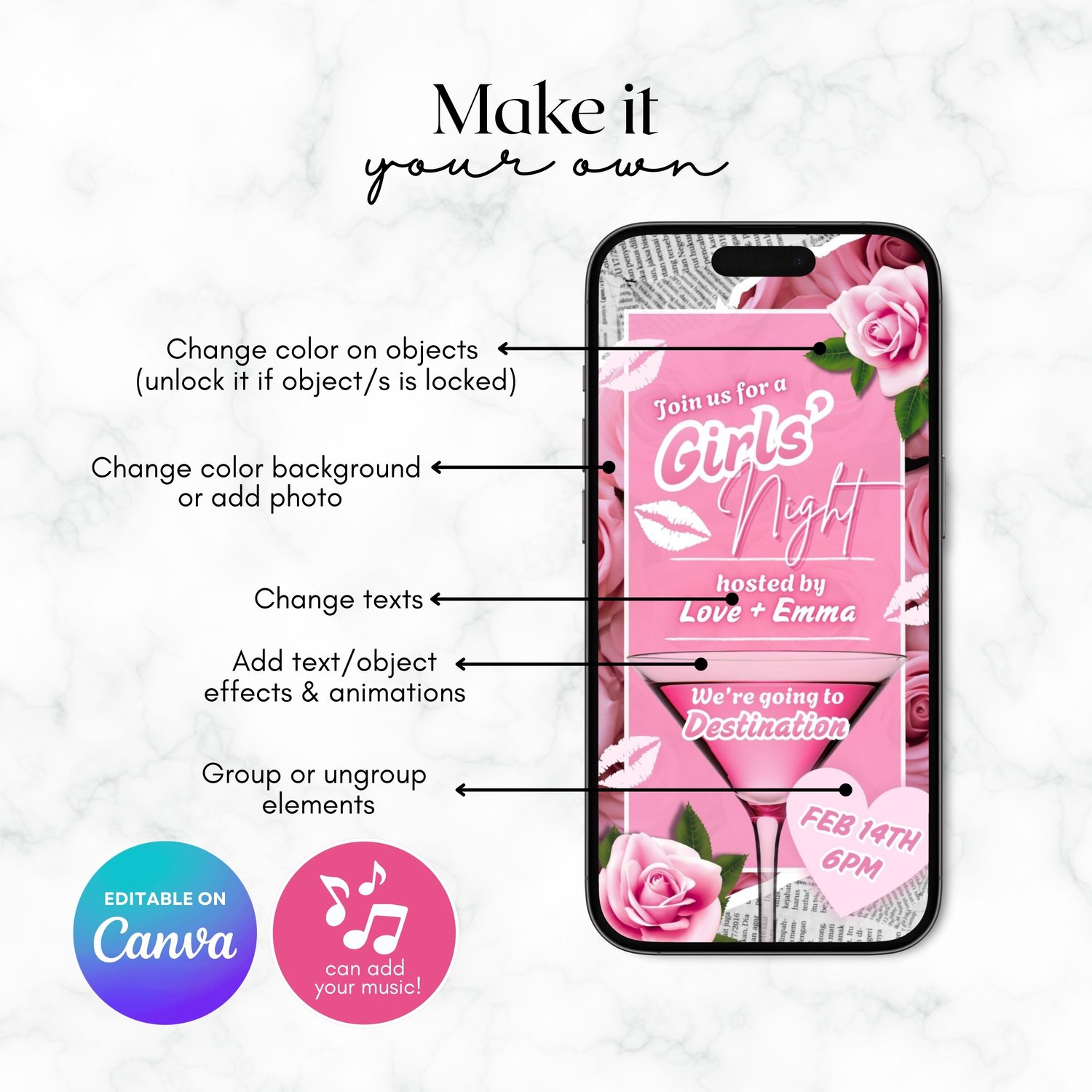 💕 Valentines Girls Night Video Invite, Pink Galentines Party for Cocktail Dinner Night Invitation (Animated Canva Video Template) 💕
