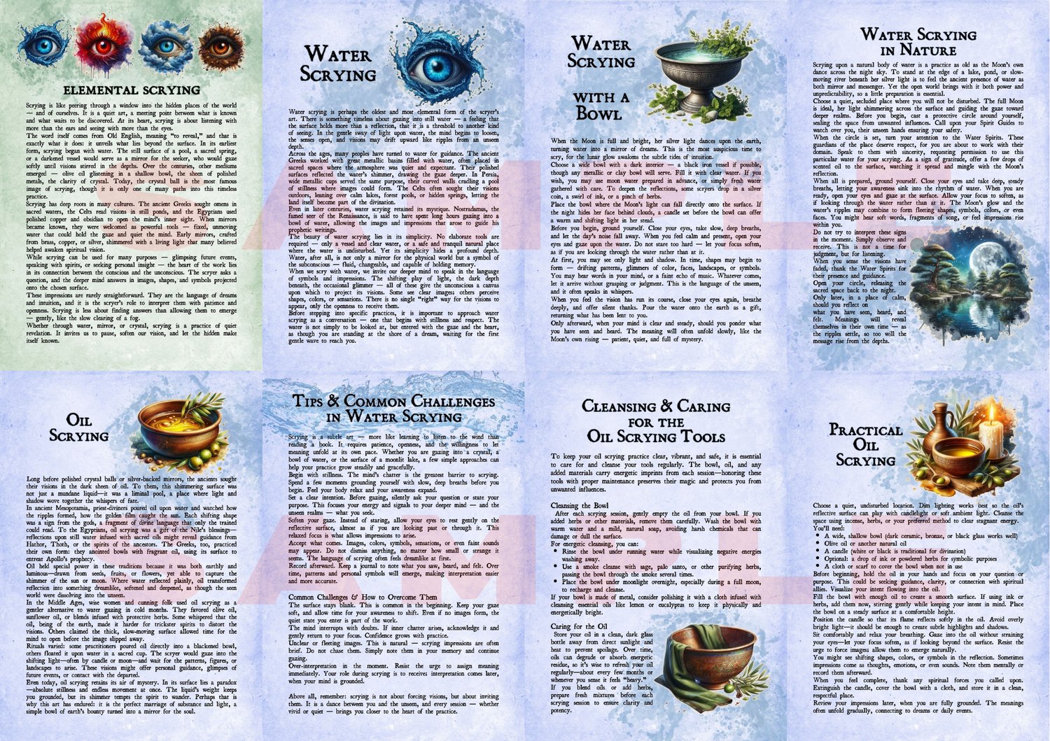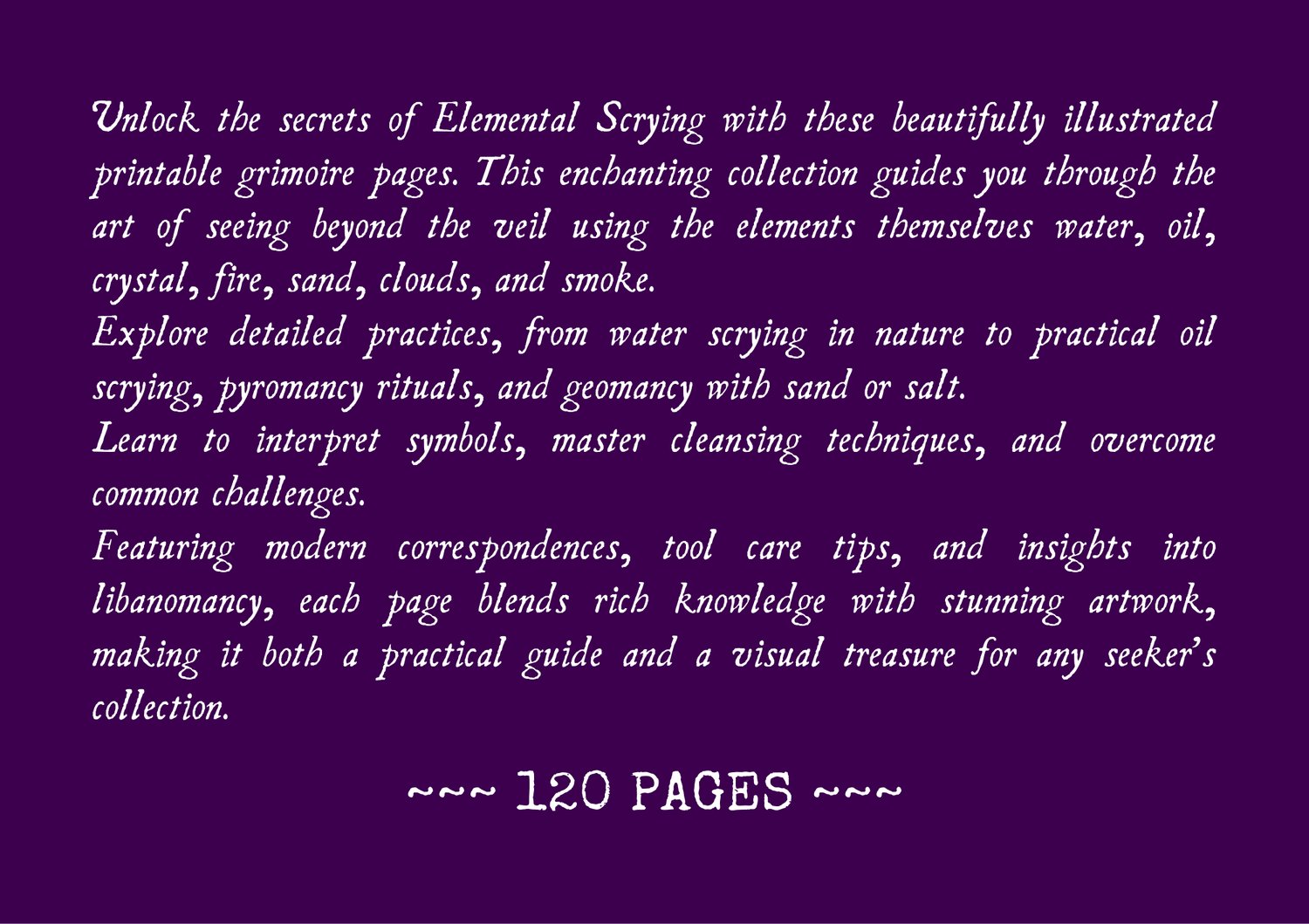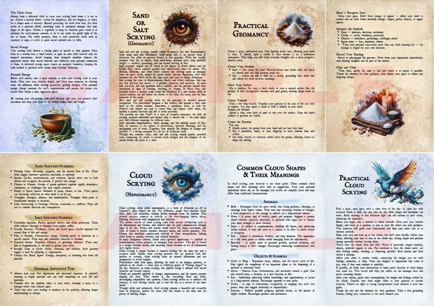 Unlock the secrets of Elemental Scrying with these beautifully illustrated printable grimoire pages. This enchanting collection guides you through the art of seeing beyond the veil using the elements themselves — water, oil, crystal, fire, sand, clouds, and smoke. Explore detailed practices, from water scrying in nature to practical oil scrying, pyromancy rituals, and geomancy with sand or salt. Learn to interpret symbols, master cleansing techniques, and overcome common challenges. Featuring modern correspondences, tool care tips, and insights into libanomancy, each page blends rich knowledge with stunning artwork, making it both a practical guide and a visual treasure for any seeker’s collection.