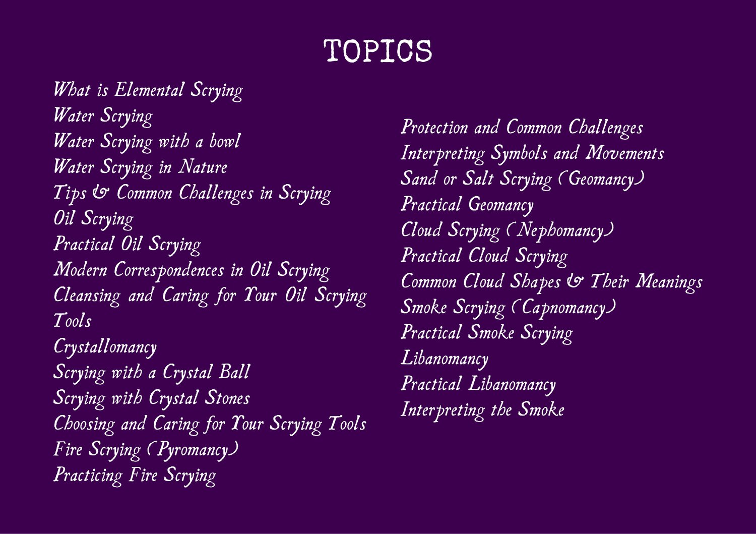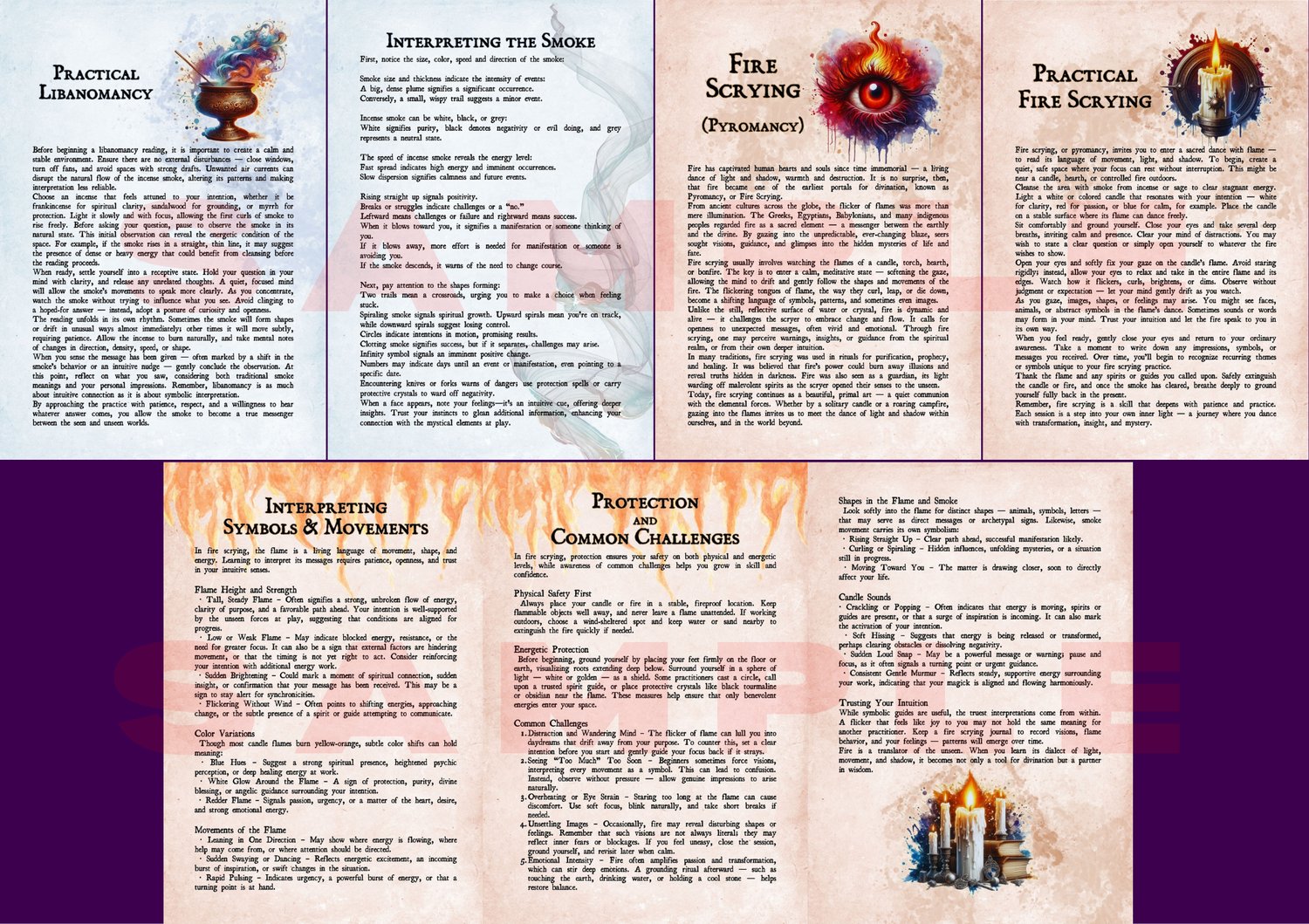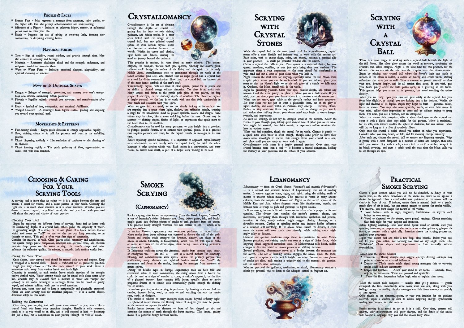 Unlock the secrets of Elemental Scrying with these beautifully illustrated printable grimoire pages. This enchanting collection guides you through the art of seeing beyond the veil using the elements themselves — water, oil, crystal, fire, sand, clouds, and smoke. Explore detailed practices, from water scrying in nature to practical oil scrying, pyromancy rituals, and geomancy with sand or salt. Learn to interpret symbols, master cleansing techniques, and overcome common challenges. Featuring modern correspondences, tool care tips, and insights into libanomancy, each page blends rich knowledge with stunning artwork, making it both a practical guide and a visual treasure for any seeker’s collection.