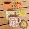 Celebrate the beauty of fall with this handmade set of mug-shaped bookmarks, inspired by the warm tones and patterns of the season. Each piece is carefully crafted from layered recycled cardboard and patterned scrapbook paper, finished with a carved handle and a “coffee or hot chocolate” liquid accent, and a decorative twine tassel.