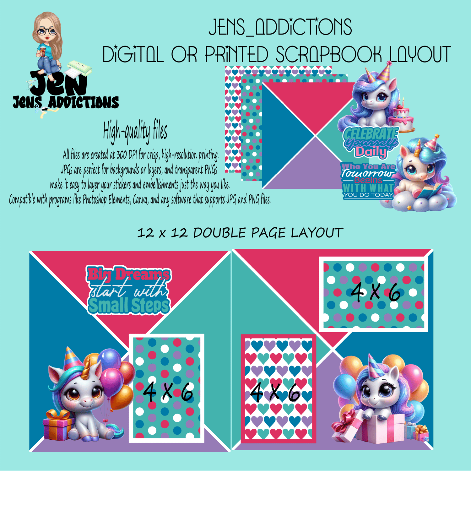 This digital scrapbook layout kit is packed with playful charm—featuring 4 sweet unicorns, 3 versatile celebration-themed titles, gift boxes, balloons, and more!