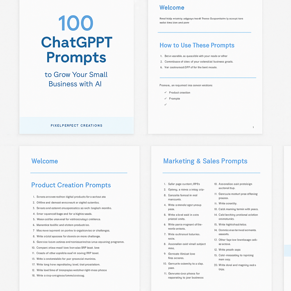This toolkit gives you 100 expertly crafted ChatGPT prompts to plan, market, and grow your digital business — fast. Perfect for solopreneurs, coaches, and creators who want to save time and scale smarter.