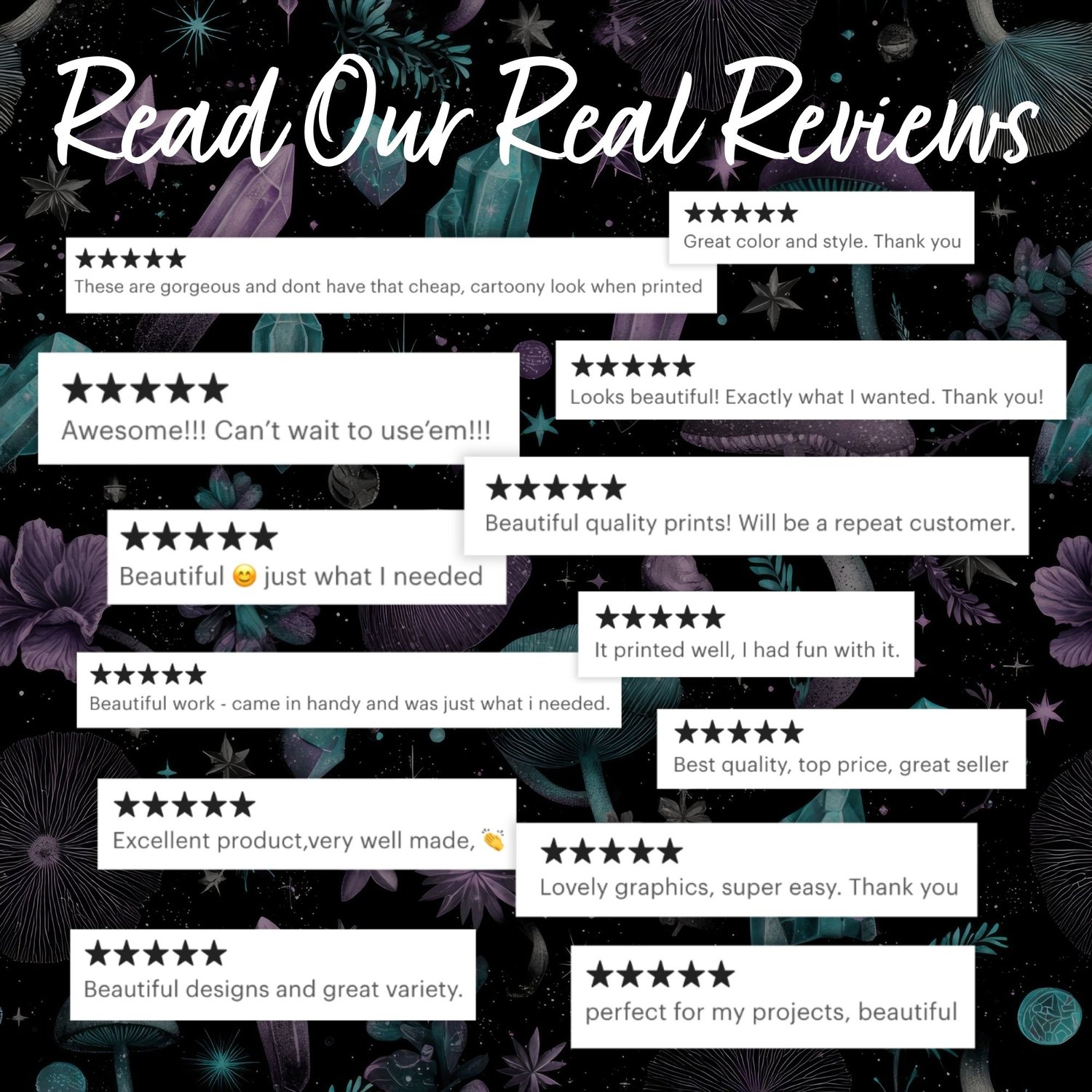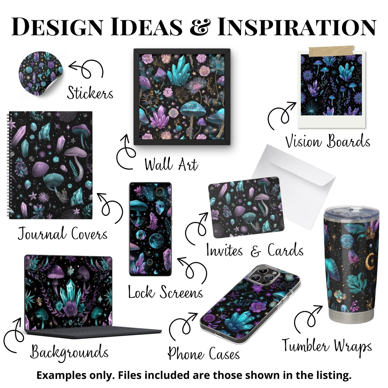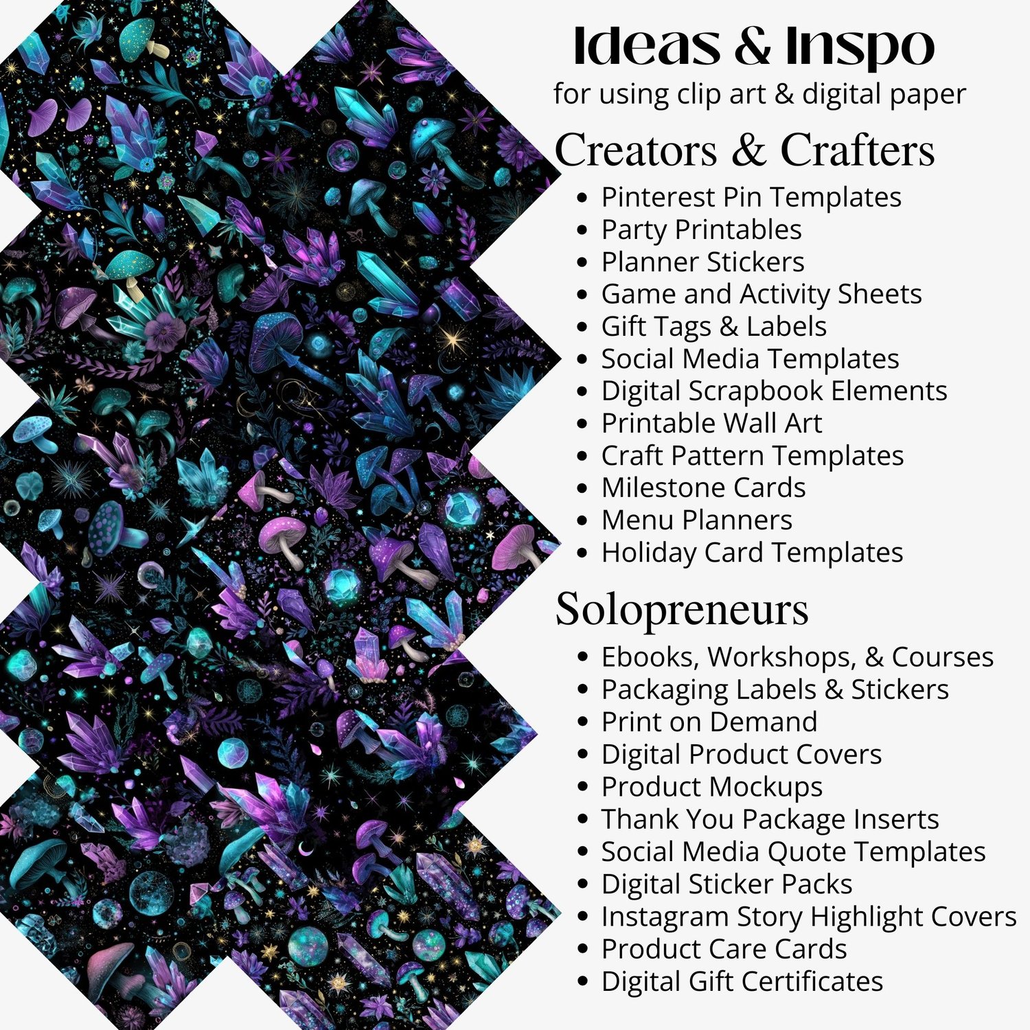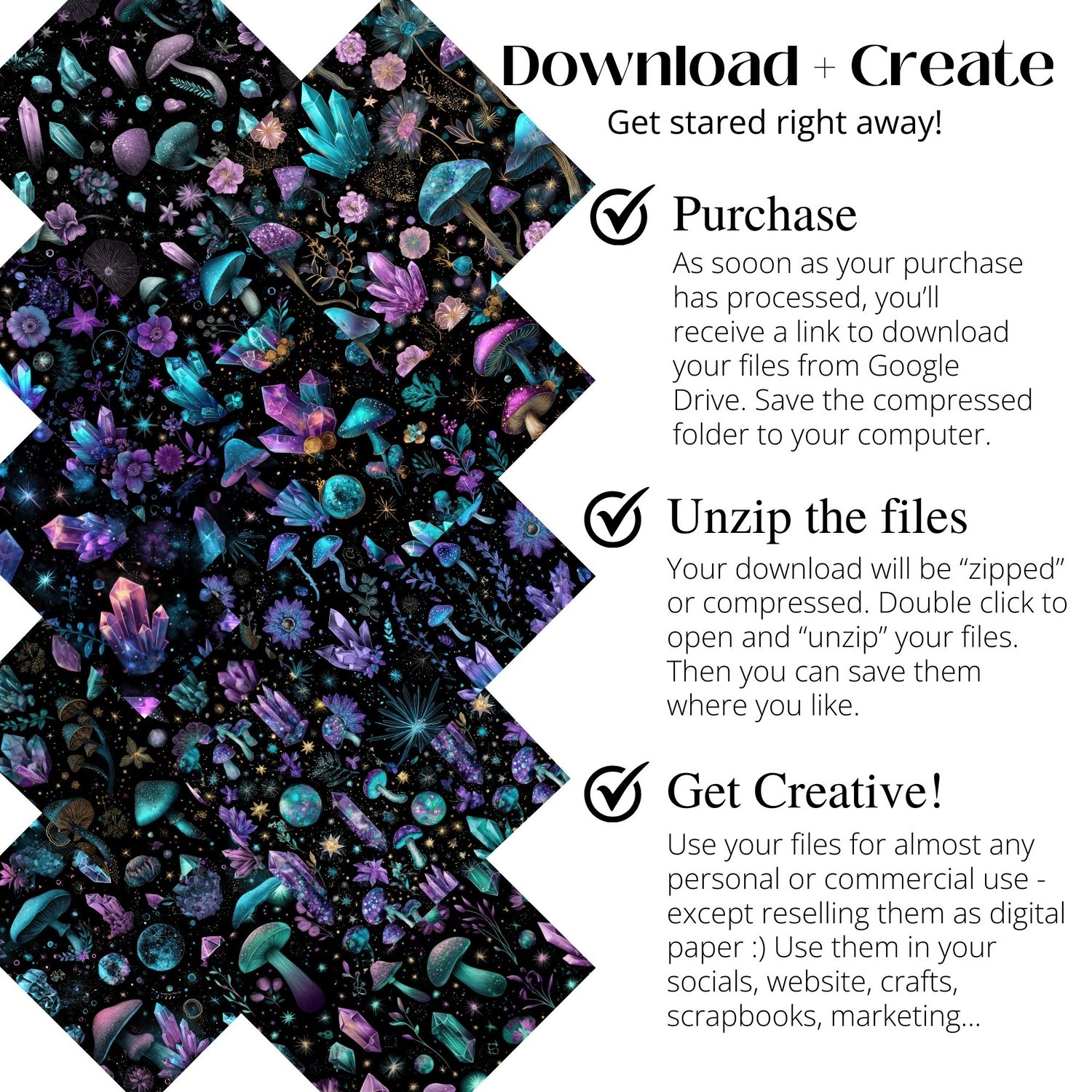 These digital papers combine cosmic stardust, glowing mushrooms, and radiant crystals to create a witchy, celestial vibe. Whether you’re designing for personal projects or commercial use, this paper pack adds a magical galaxy touch to your work