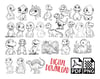Included are 50 illustrations of a cute baby dinosaur creatures, each on a separate page in full Letter / A4 size, 300 dpi.