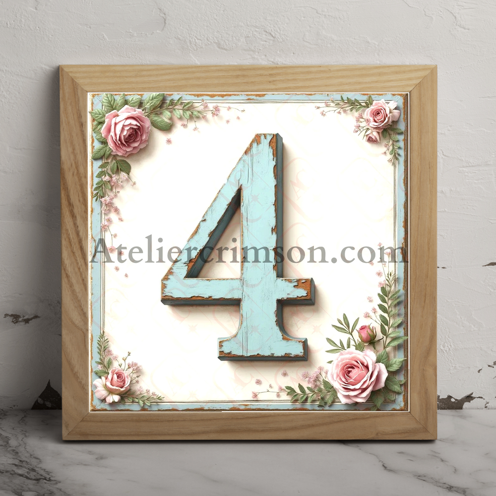 Number 4 shabby chic blue a work of art in soft pastel blue. These elegant characters, reminiscent of weathered painted wood, stand out against a delicate off-white background with subtle floral accents. Perfect for vintage-inspired home decor, DIY projects, or creating unique, personalized gifts with a touch of timeless elegance.