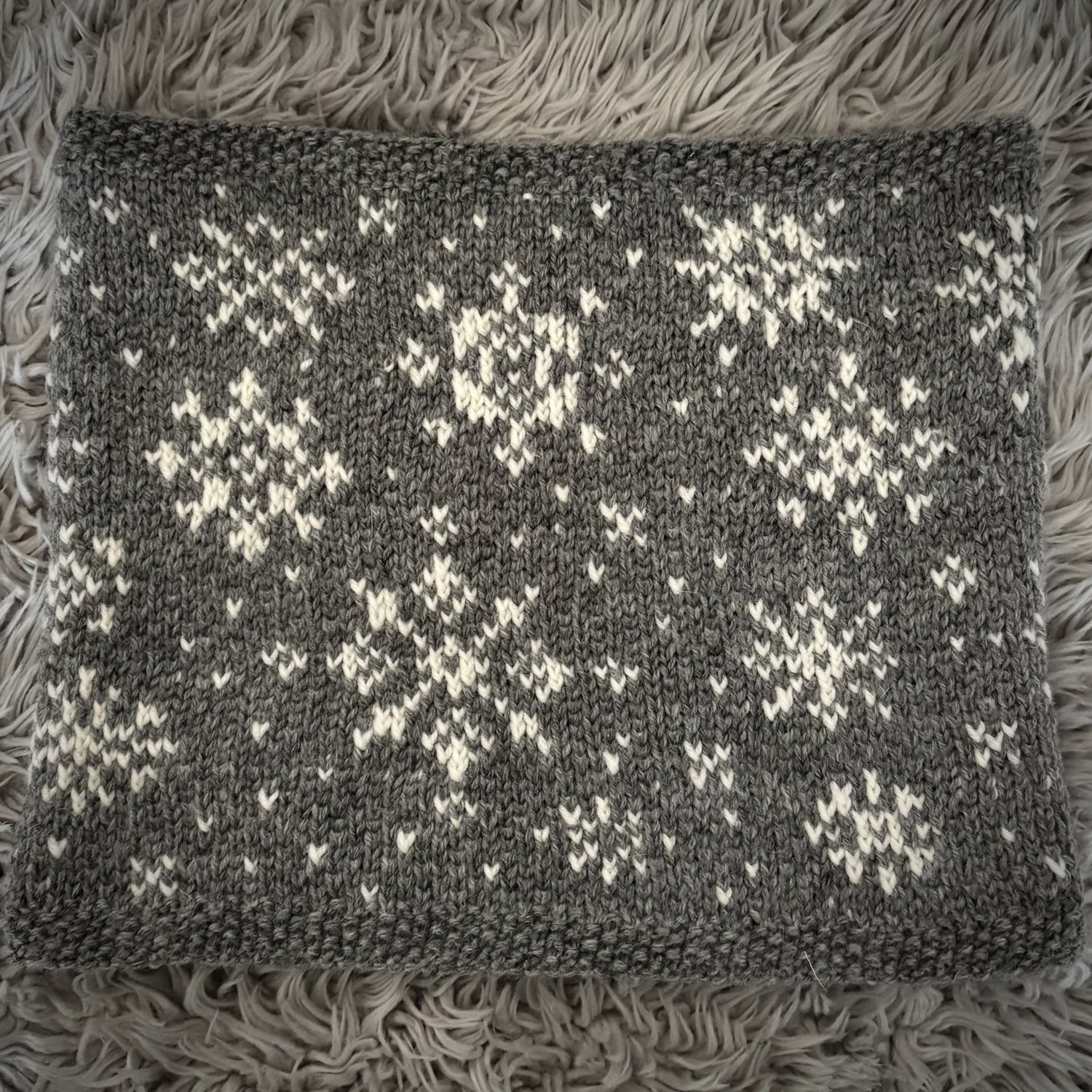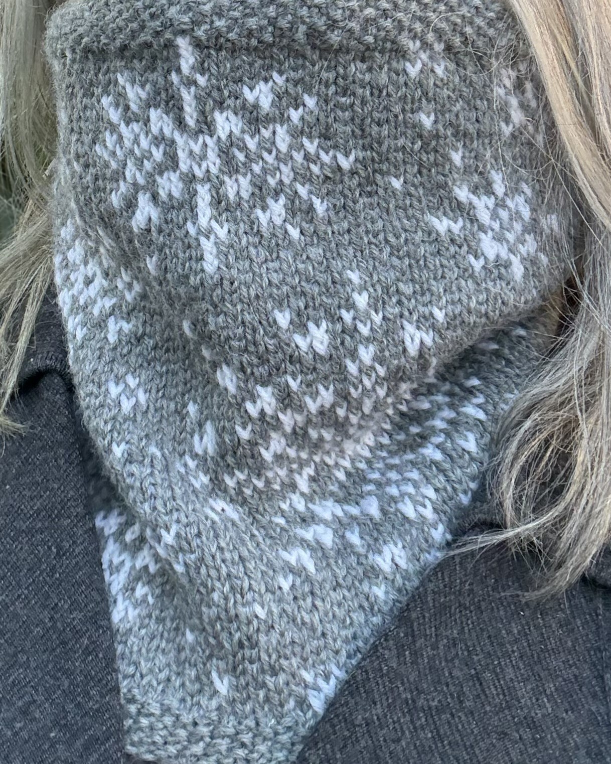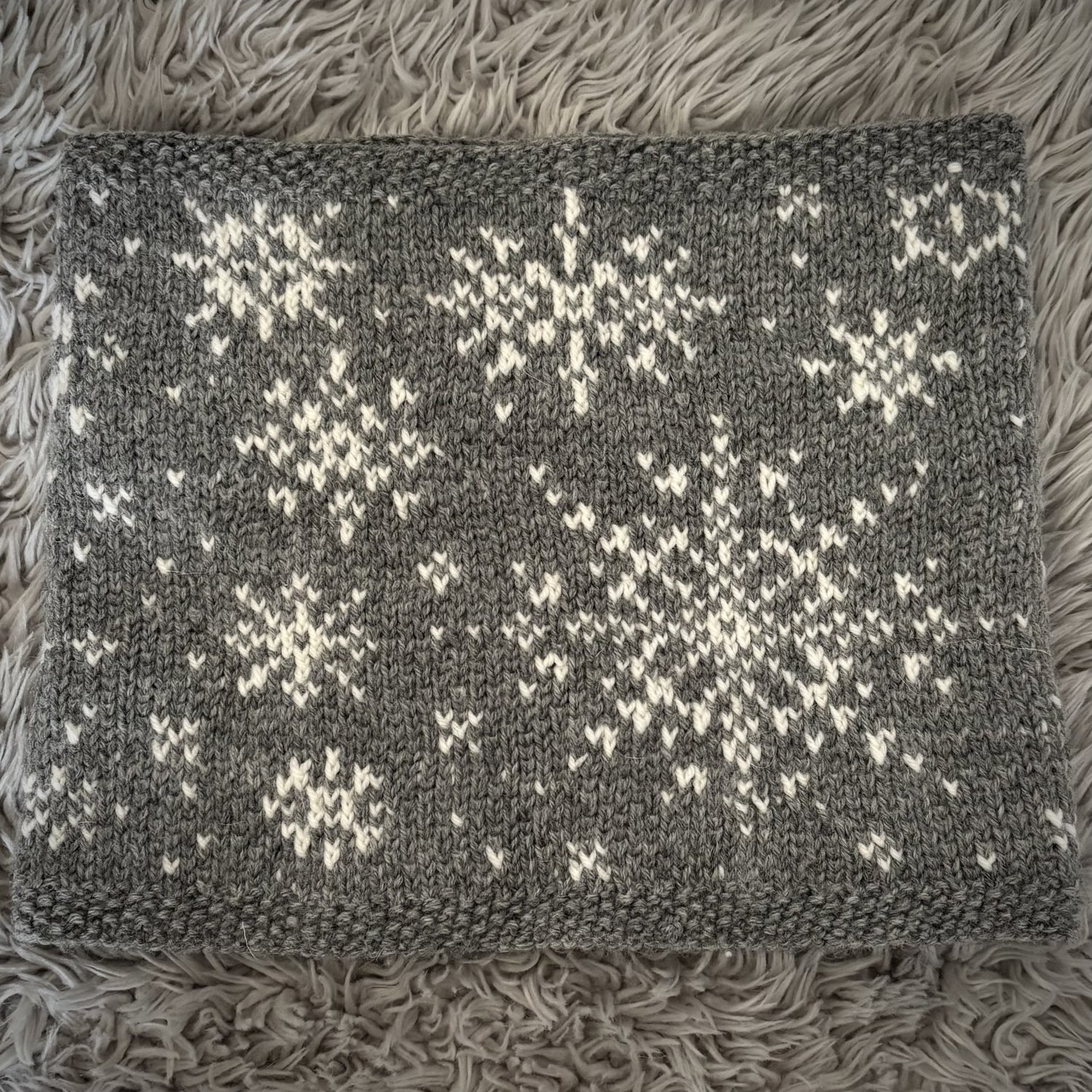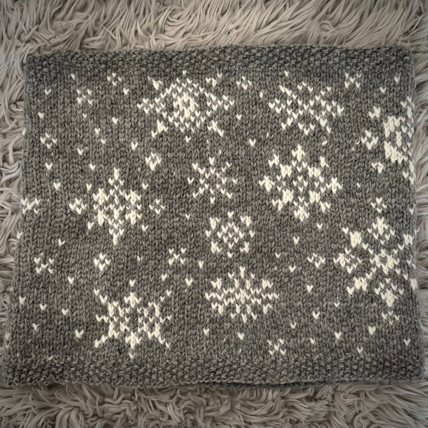 The cowl uses DK yarn, but being a colourwork project it certainly feels cosier whilst you're working on it and indeed wearing it. You can use two colours as I have in the sample or you can use up some left over yarns for the snowflakes to create a multicoloured tableau.