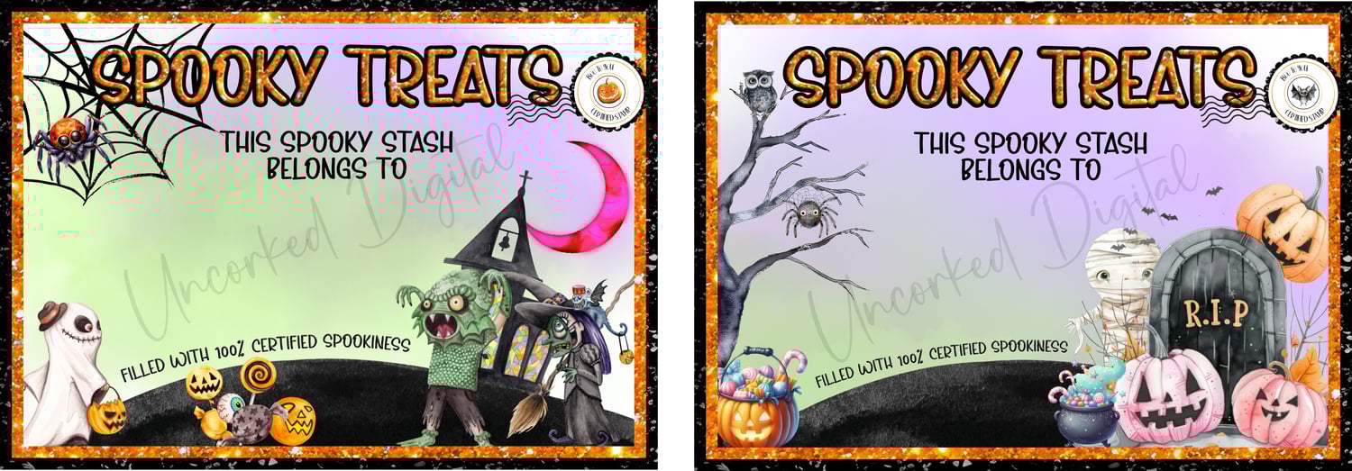 2 x Spooky Treats halloween treat box decals, with space to personalise, these are perfect for printable vinyl or eco solvent stickers from TD Blanks - https://tdprints.co.uk/shop/custom-eco-solvent-treat-box-gloss-sticker-upload-your-own-design/