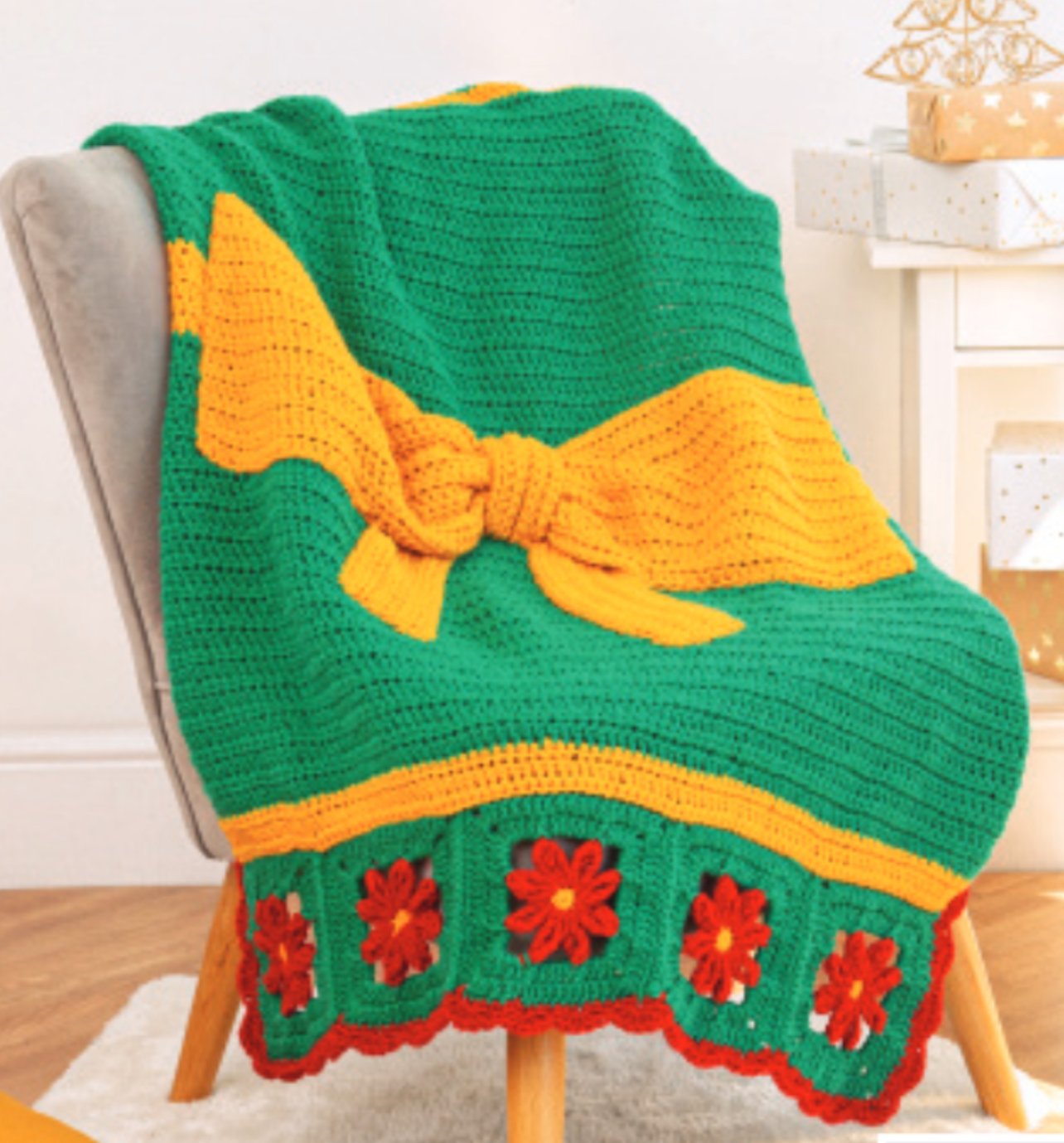 As I worked on this design, I couldn’t help but think about those beautiful, oversized bows that seem to appear on every gift in the movies. That’s when inspiration struck: what if the lapghan itself could be a gift, complete with a big, bold bow on the front? Now, whenever I drape it over my lap to watch a favourite film, it feels just like being wrapped up in a present, ready to enjoy the magic of the season.
