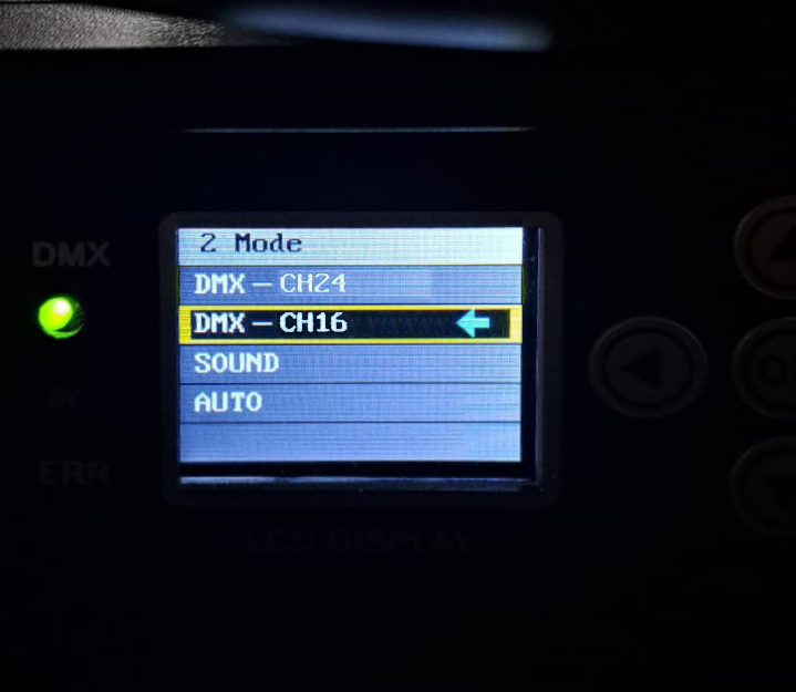 * Verifique que el display del equipo muestre los modos dmx de 16CH y 24CH.
