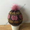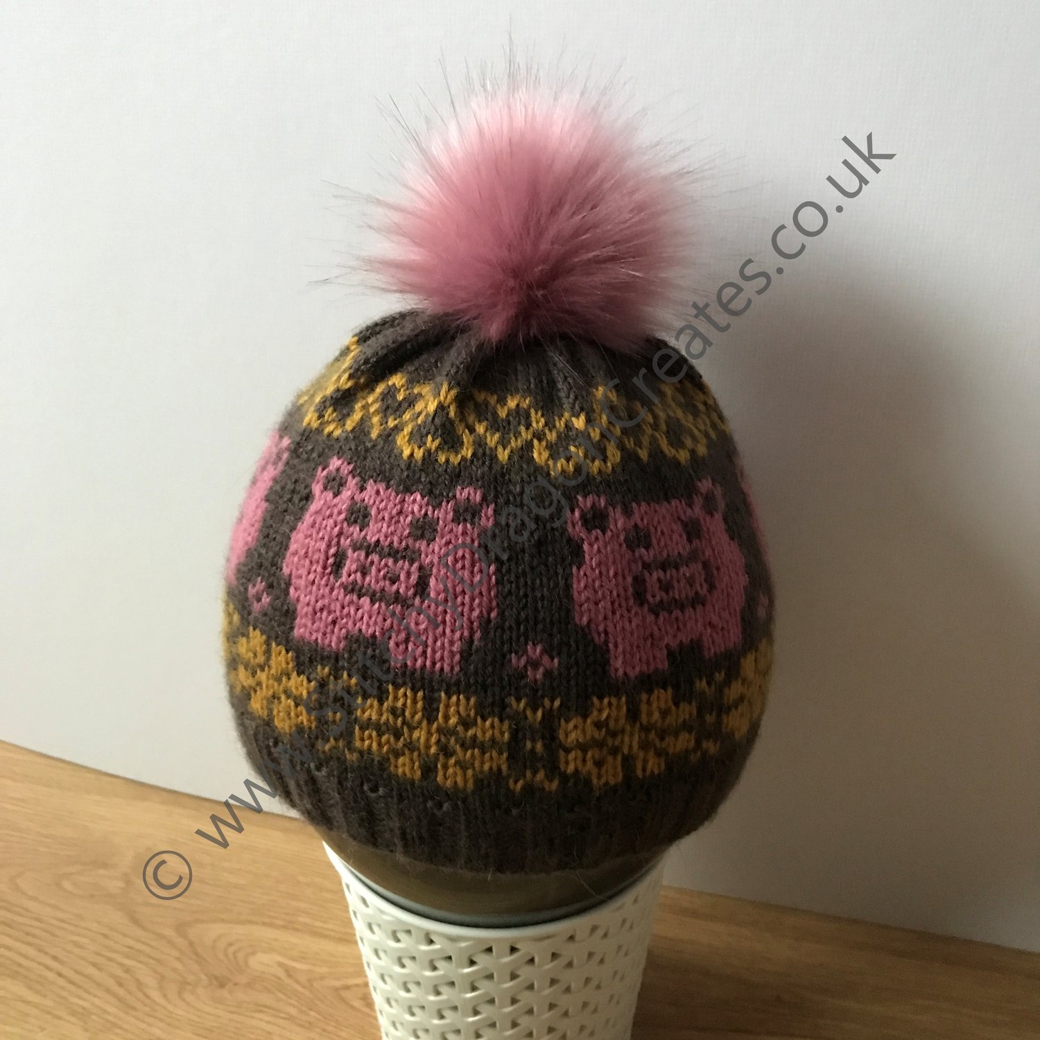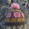 Method: This stranded colorwork hat is knit in the round from the brim up. Featuring cute pigs, hearts, and flowers, it can be worked in three or more contrasting colors and topped off with a fluffy pompom.