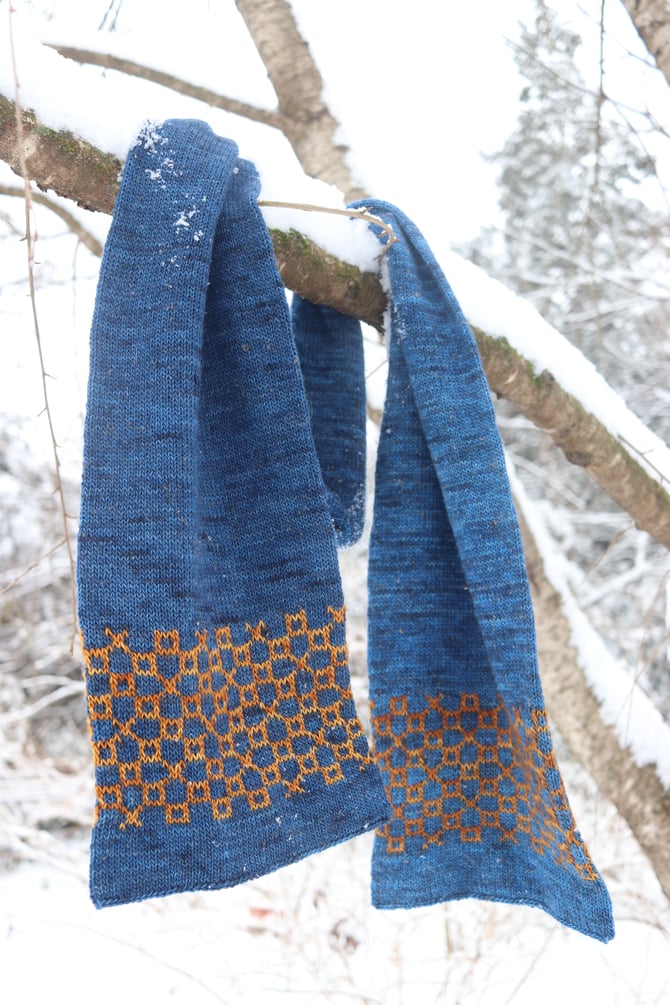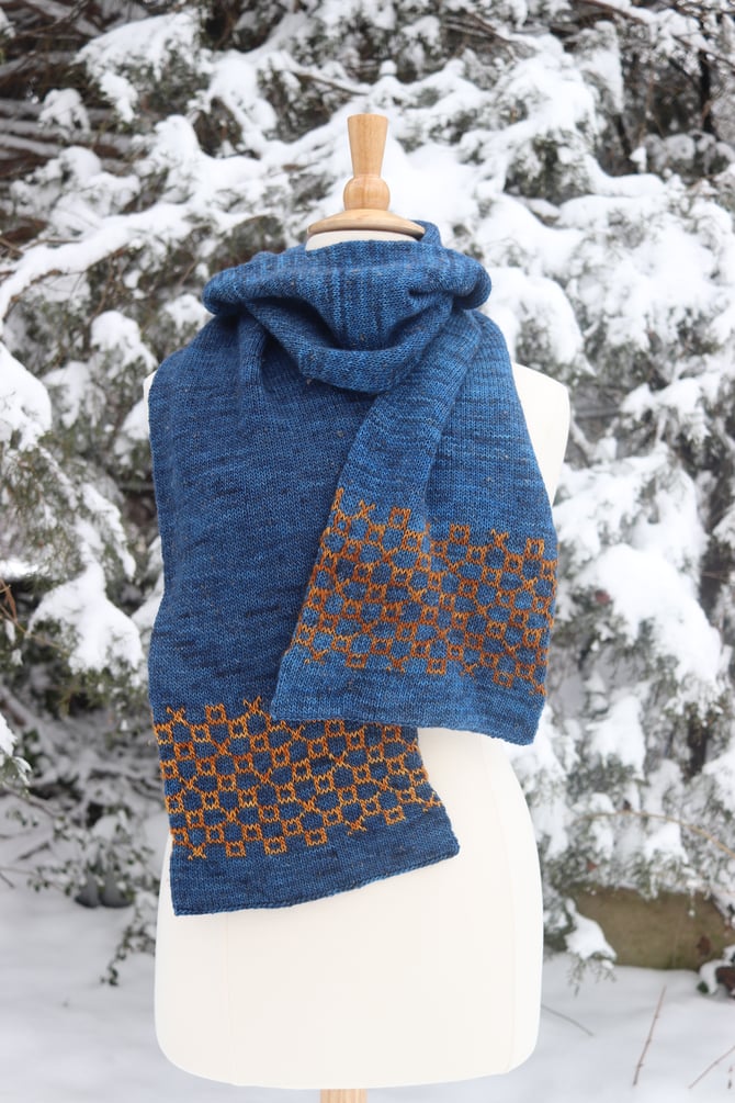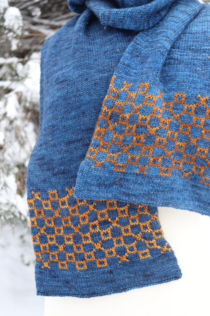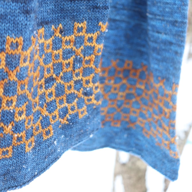 If not, it was a relaxing, pleasurable project. The double thick scarf is knit end-to-end, beginning with a provisional cast on. Each end is bordered with an easily memorized stranded motif, with miles of soothing stockinette in the round in between. It’s perfect knitting for watching your favorite shows, or your online biochemistry lectures. The final step is a three needle bind off to close each end of the tube.
