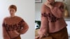 The pullover is worked top down seamless in the round, featuring floral colourwork running across the bottom of the yoke and continuing on the body. Sleeves have an elegant balloon shape, and both bottom and neckline edges are finished with stockinette hem in contrasting colour. Instructions for a classic fitted sleeve are also provided.