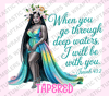 Isaiah 43:2 Christian design featuring a confident Black woman illustration with floral accents. Perfect for shirts, tumblers, wall art, and faith-based crafts. Digital PNG download for crafters and small business owners.