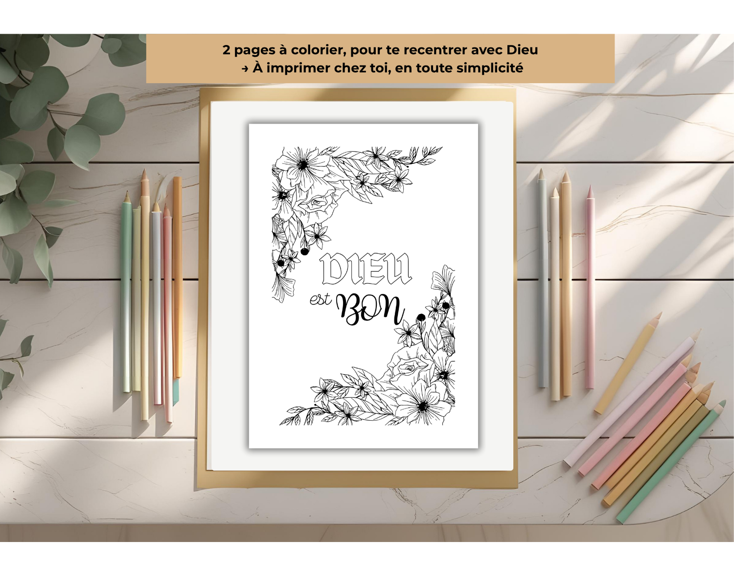 2 pages chrétiennes à colorier – Dieu est bon & Tu es aimée