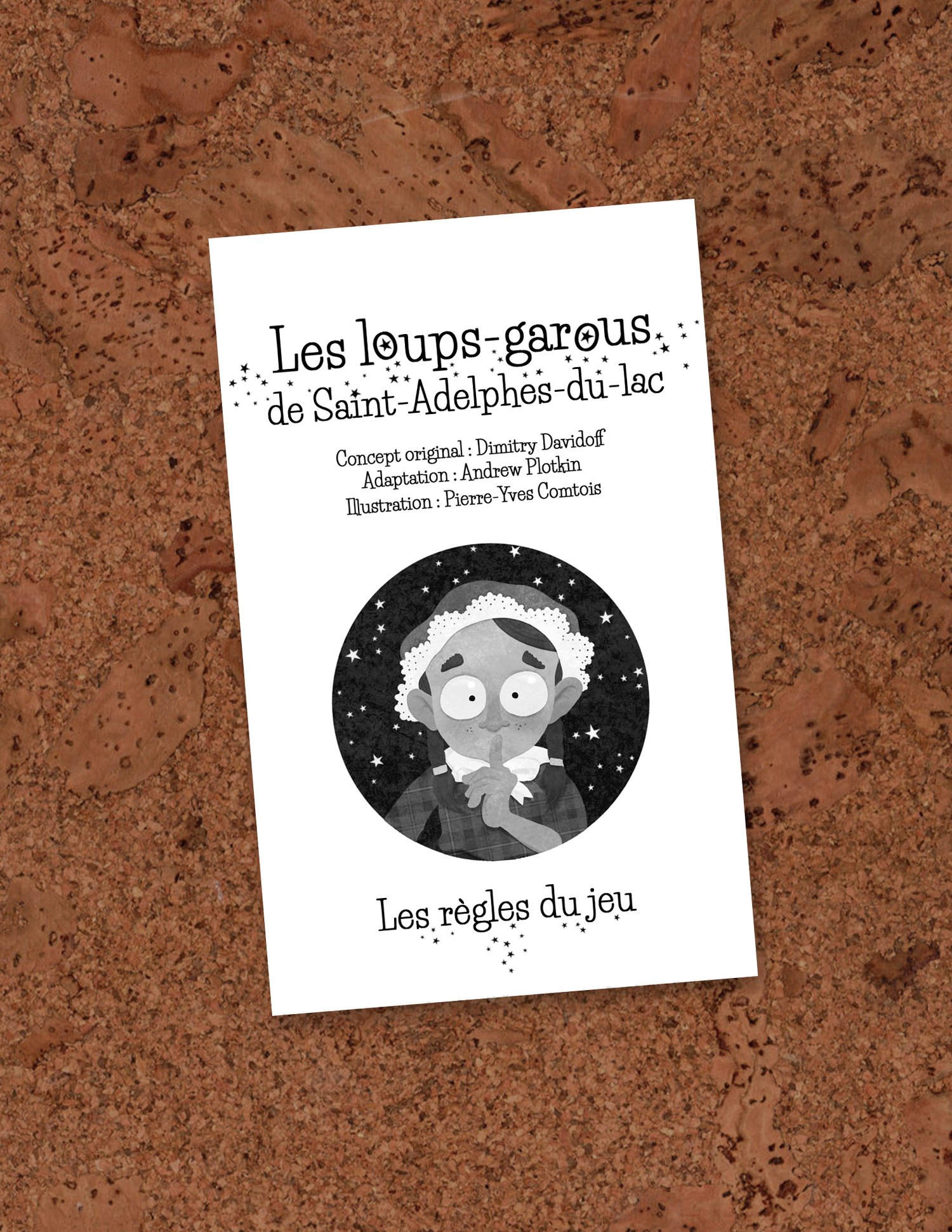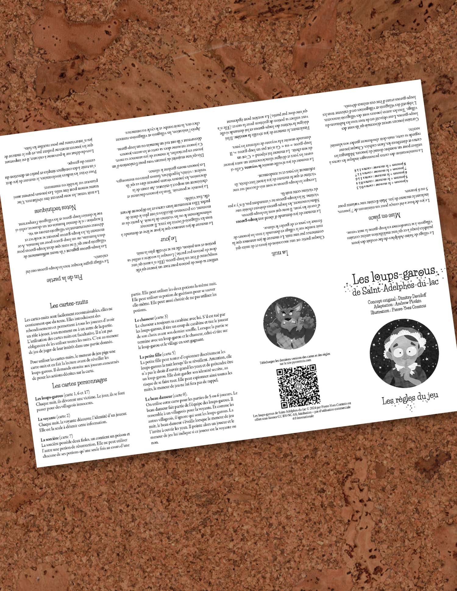 Téléchargez le zine des règles (document PDF, 8.5″ x 11″, 2,45 Mo.) du jeu Les loups-garous de Saint-Adelphes-du-lac. Ce document présente brièvement les règles du jeu dans un format idéal pour accompagner les cartes. Vous pouvez consulter des règles plus détaillées en ligne : Règles détaillées.