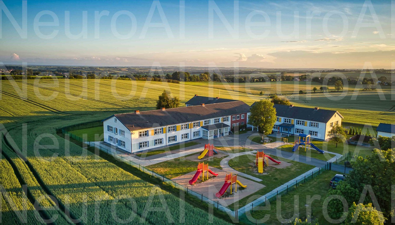 Rural school nestled in a tranquil, golden wheat field