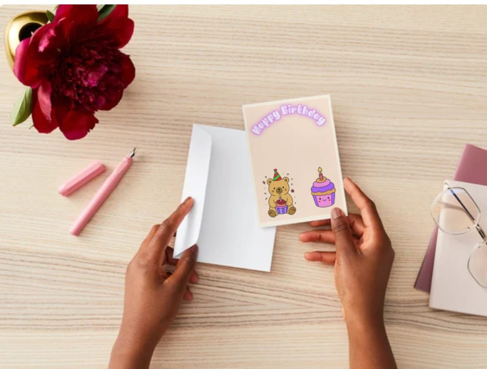 Cute bear-themed birthday card featuring a bear holding a cupcake and a smiling cupcake illustration. Soft pastel background with “Happy Birthday” text. Perfect for kids’ birthdays, printable, instant download.