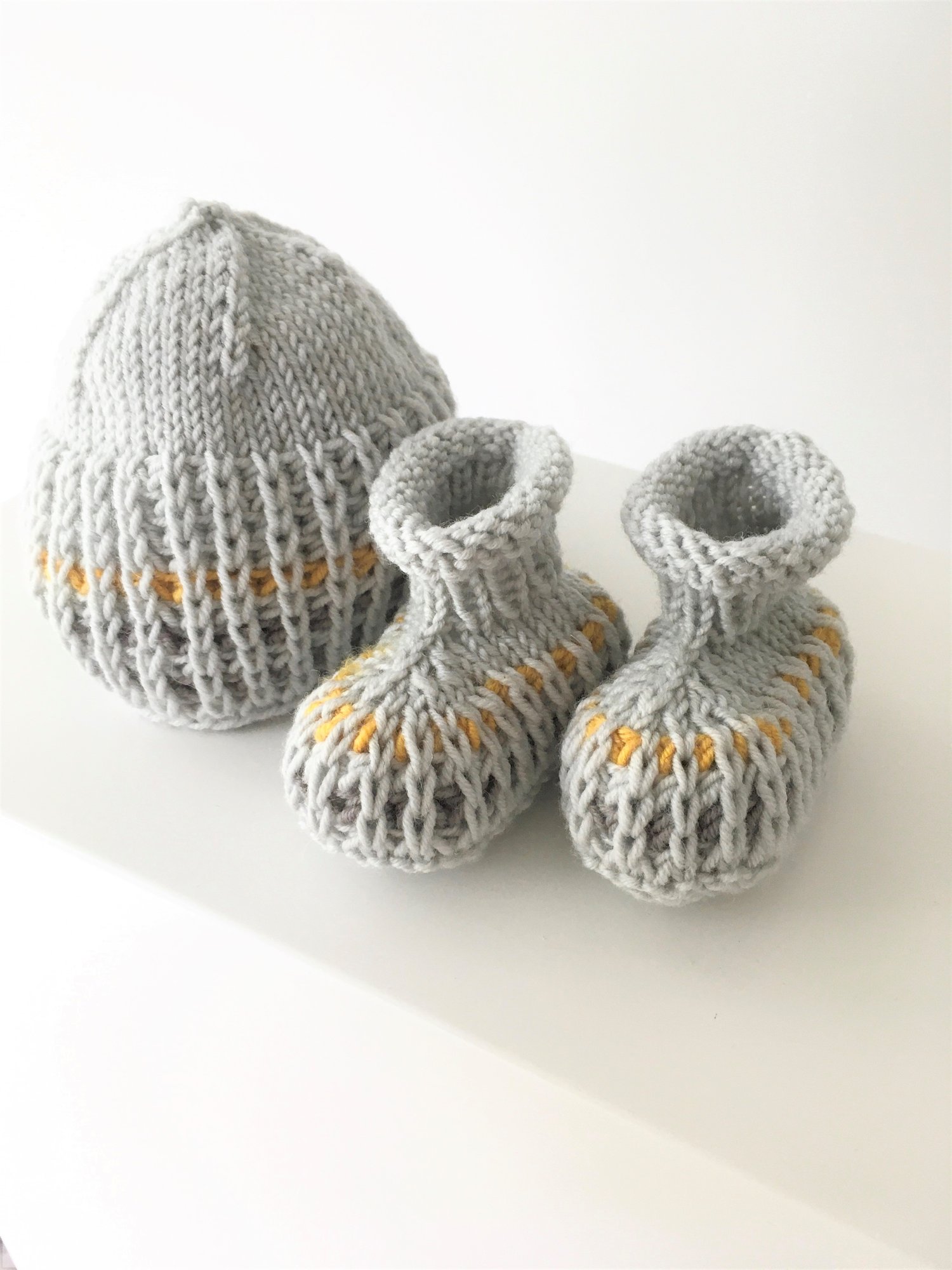 Both the hat and booties are knitted in-the-round from the bottom up. The tuck stitch pattern makes them soft and very stretchy.