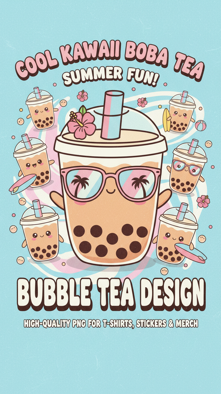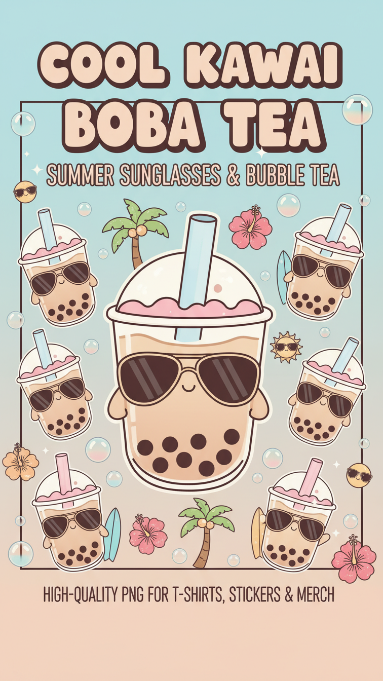 Cool Kawaii Boba Tea Clipart Bundle - Summer Sunglasses Bubble Tea Design (High-Quality PNG for T-shirts, Stickers & Merch)