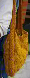 Fans of cabling, here’s a new challenge for you: this tote IS cabled, but not in a traditional roping pattern. Instead, the cables on the sides cross one knit stitch with three purls, forming sunburst checks. Just for a fun contrast, the strap is a super-traditional woven braid. This is a great project to practice cabling without a needle!
