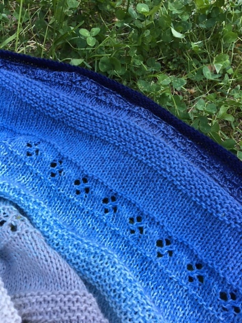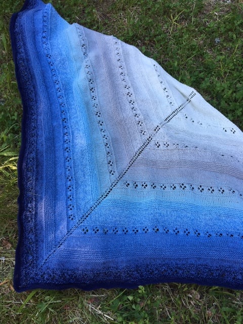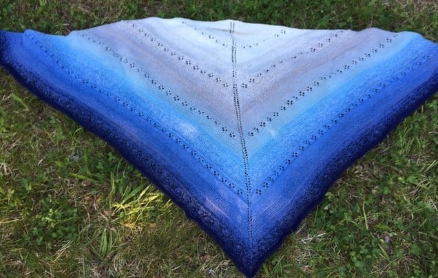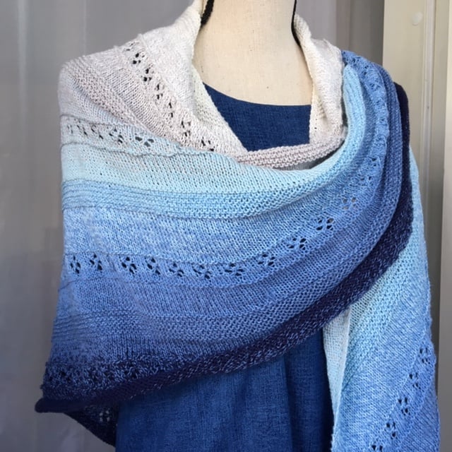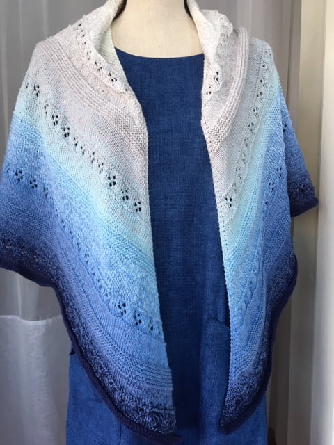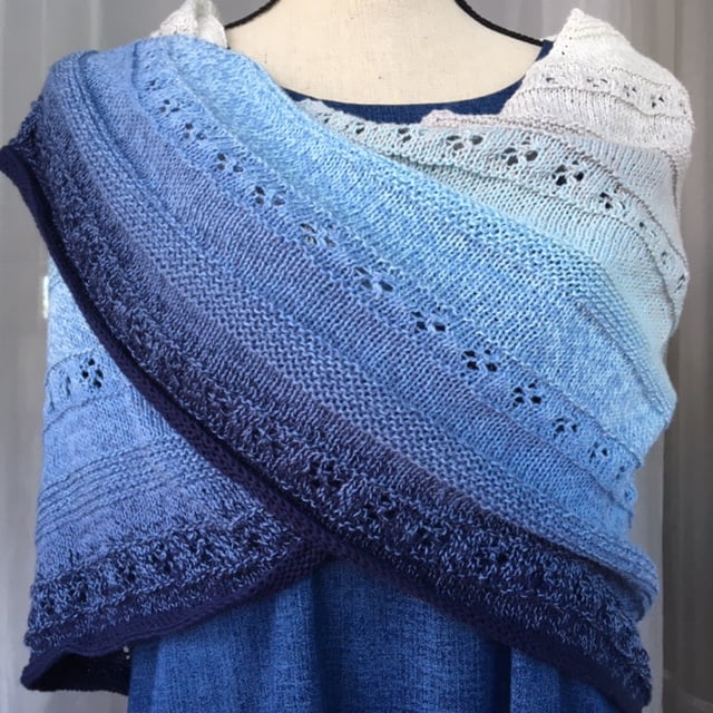 Whirl of Fortune shawl features lace pattern of four-leaf clover with stockinette and garter stitches. It is a top-down triangle shaped shawl and is knit in a soft gradient cotton yarn. It makes a perfect summer knit and summer shawl.