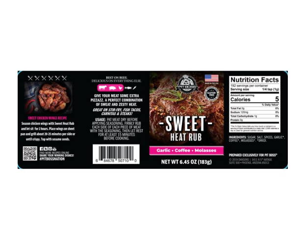 Give your food a sweet and powerful flavor with the Pit Boss Sweet Heat Rub. The molasses and fine ground coffee give this rub a delicious and truly unique taste. Rub evenly over entire surface of meat before cooking. Versatile as a rub, in a marinade, or simply as seasoning for beef, pork, or poultry. Need we say more Smoke on Boss. GLUTEN FREE, NO MSG added, and Shrink-wrapped safety sealed.