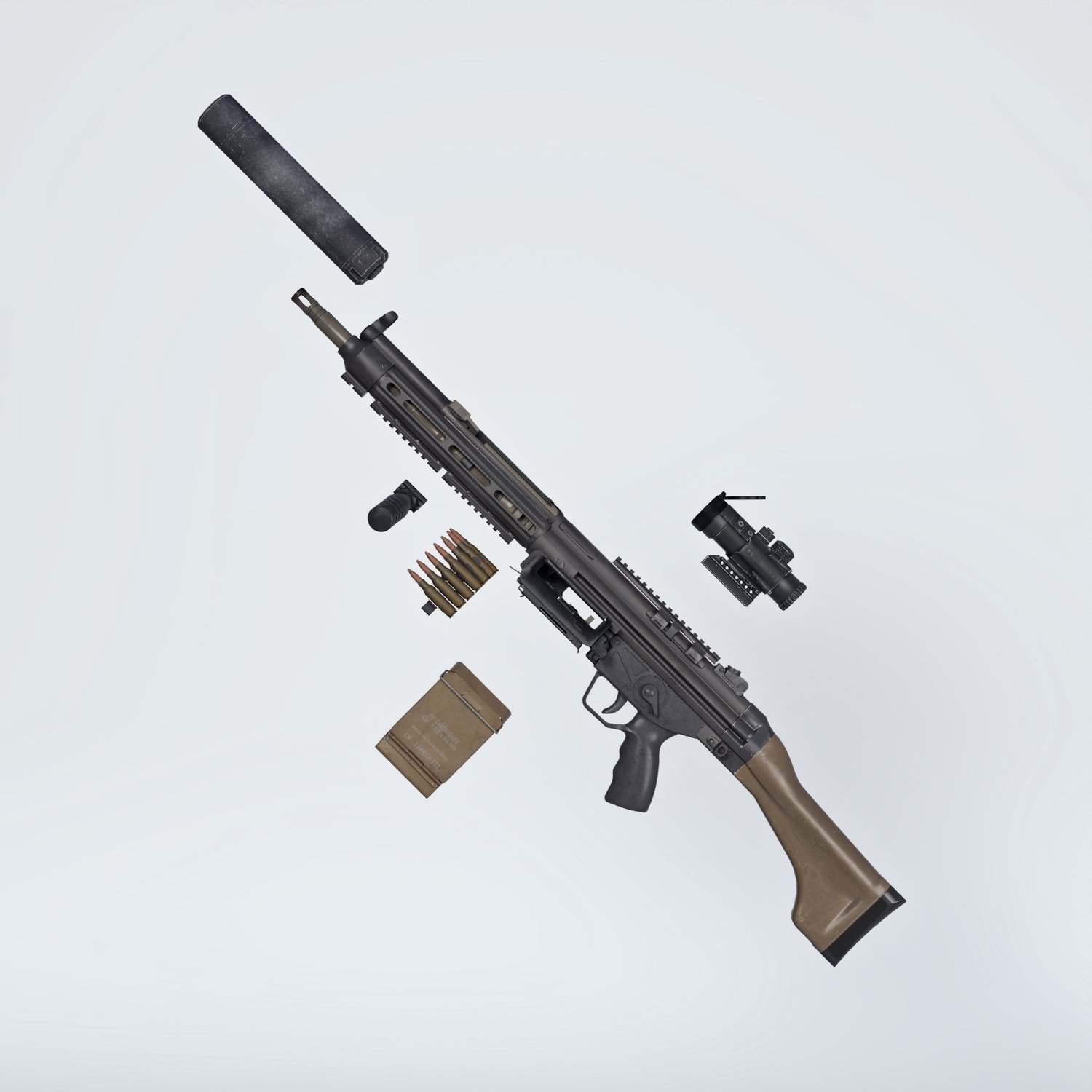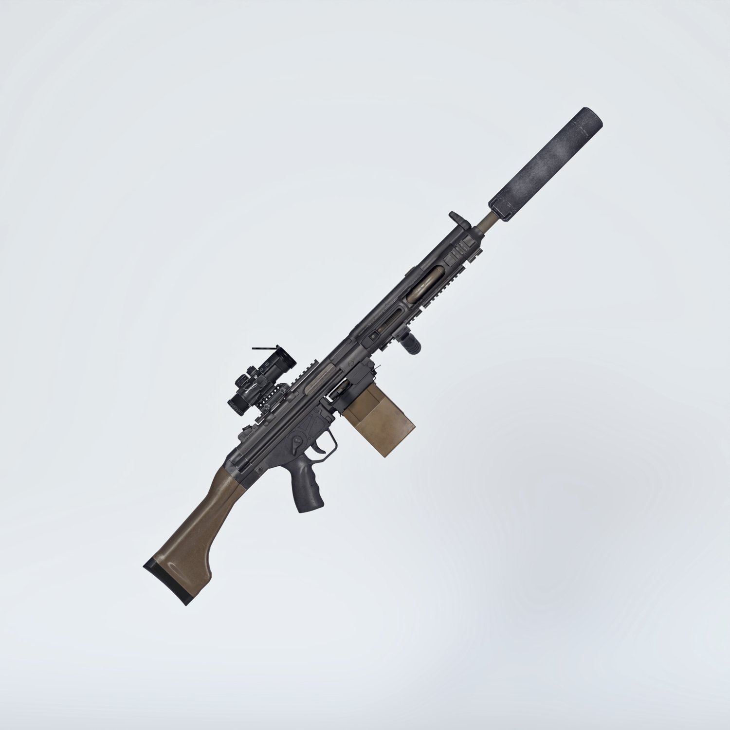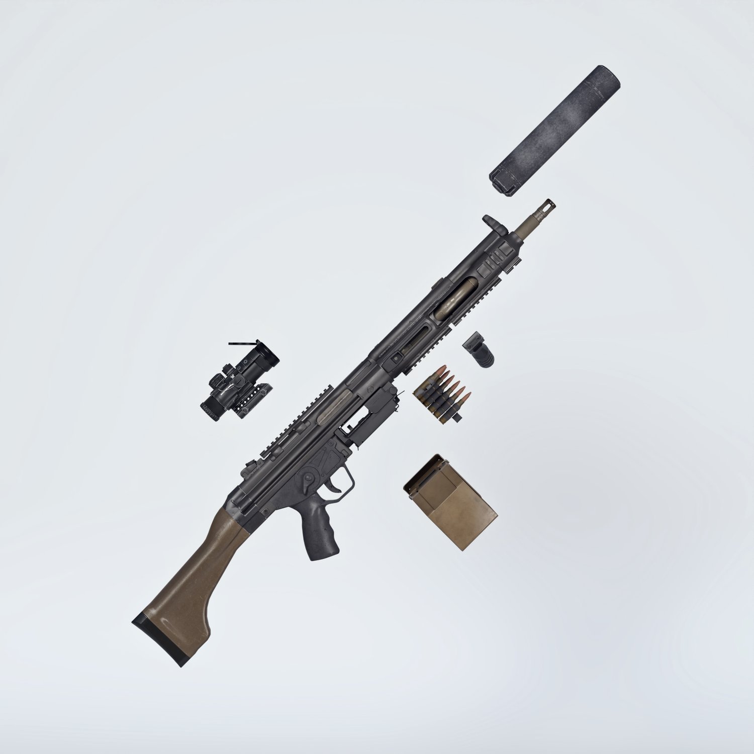 A european take on the 5.56 light machine gun. Good trusty platform for various military applications. German gun based on a military rifle, cool looking and a good performing one. Converted and rigged for use with DAZ. Trigger, safety, bolt etc also rigged for more realistic pictures. Includes a silencer, a red dot, and some other accessories for various porpoises and pictures. Since parts are rigged, the gun can be used as just the basic configuration or an upgraded modern variant.
