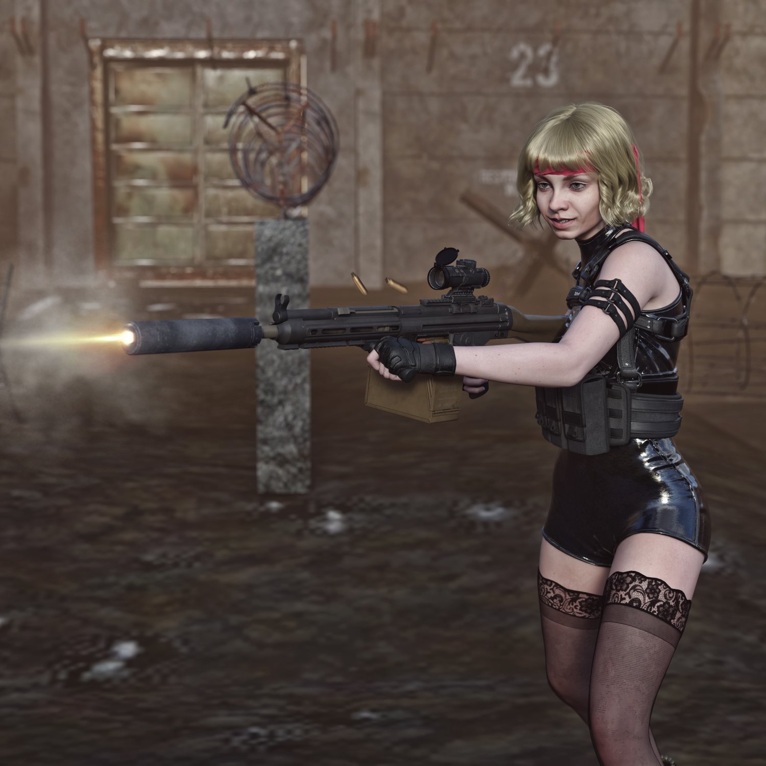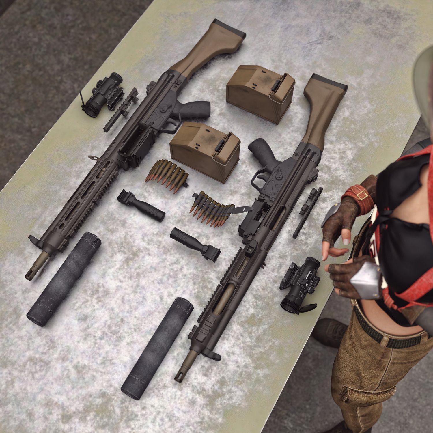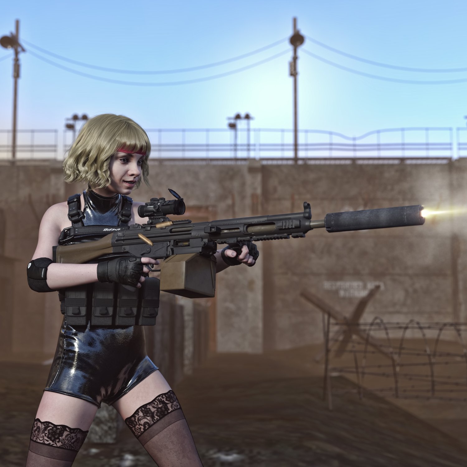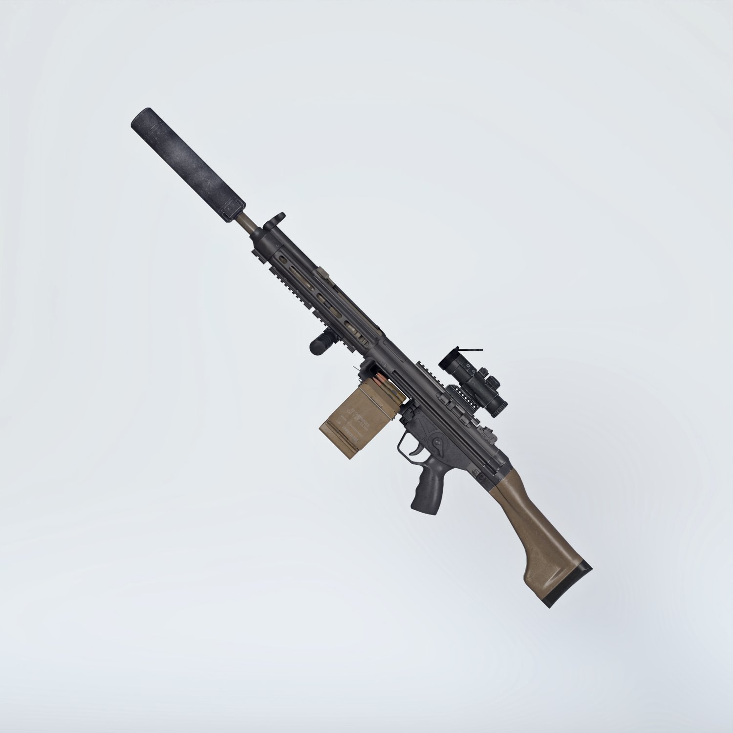 A european take on the 5.56 light machine gun. Good trusty platform for various military applications. German gun based on a military rifle, cool looking and a good performing one. Converted and rigged for use with DAZ. Trigger, safety, bolt etc also rigged for more realistic pictures. Includes a silencer, a red dot, and some other accessories for various porpoises and pictures. Since parts are rigged, the gun can be used as just the basic configuration or an upgraded modern variant.