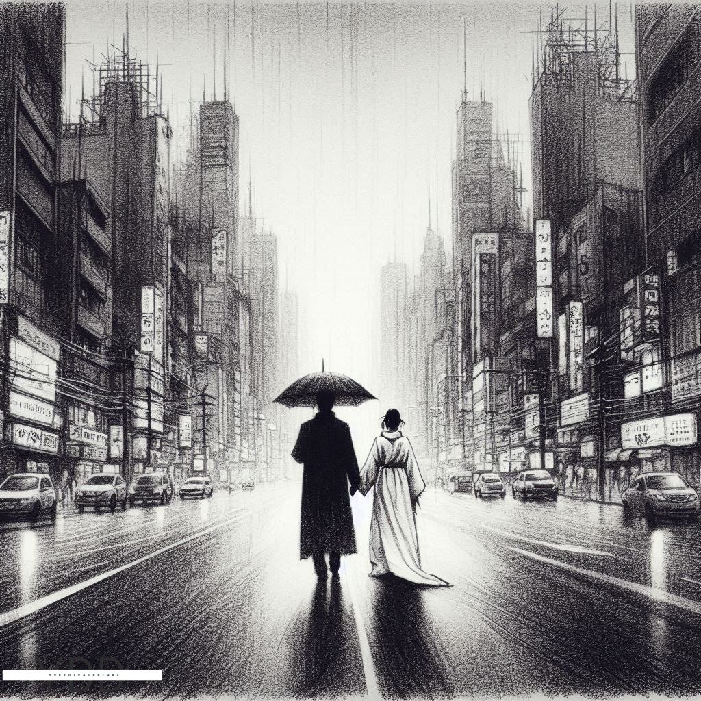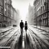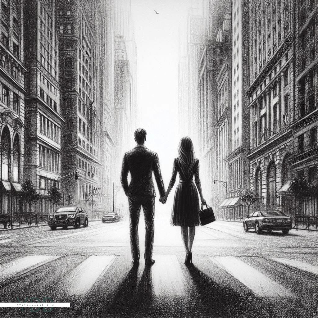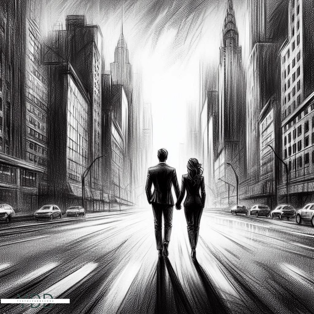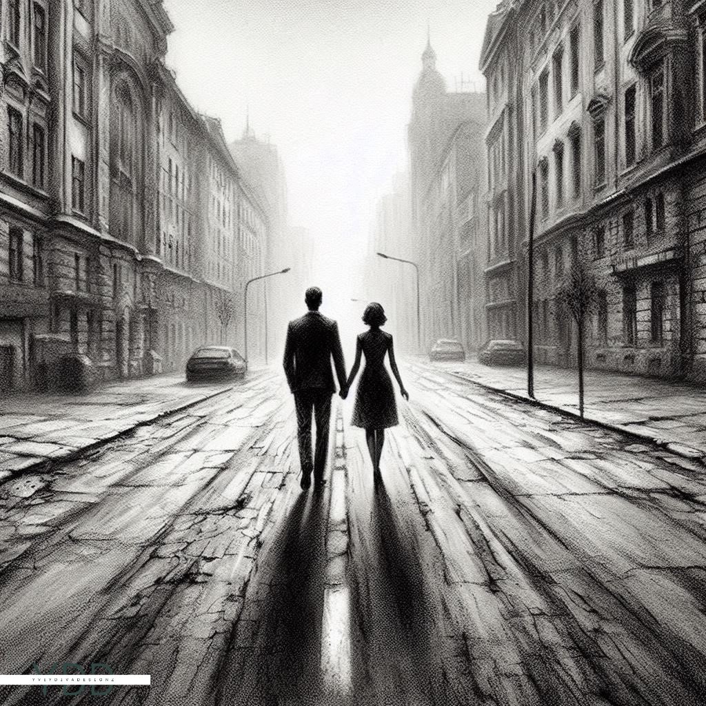 In this evocative charcoal sketch, a couple walks hand in hand down the center of an empty street, their backs turned as they journey forward. The deserted surroundings emphasize their quiet bond, leaving behind the echoes of where they've been.