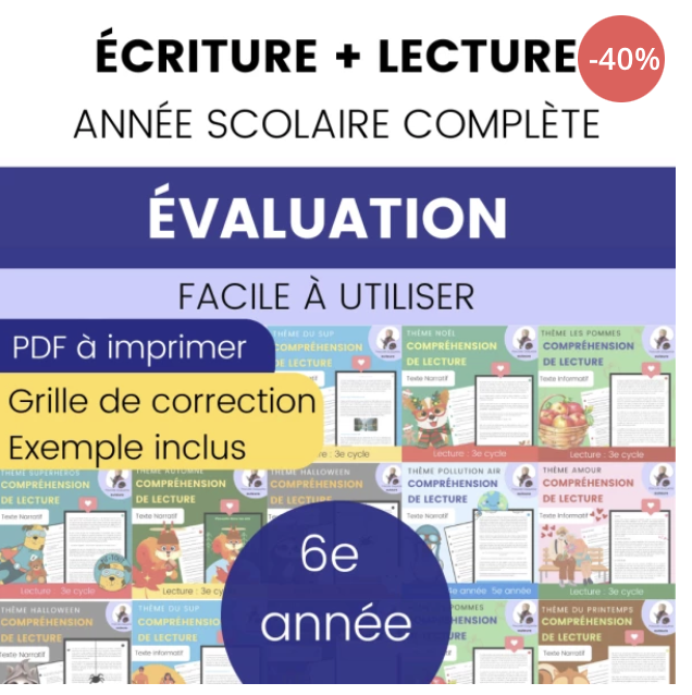 Offrez à vos élèves de 6e année une rentrée structurée, créative et alignée sur les attentes du programme avec cet ensemble d’évaluations complet pour la 1re étape. Il inclut 4 lectures (textes narratifs et informatif) accompagnées de questionnaires variés, et 4 situations d’écriture stimulantes (récit personnel, acrostiche poétique, légende, récit à thème).