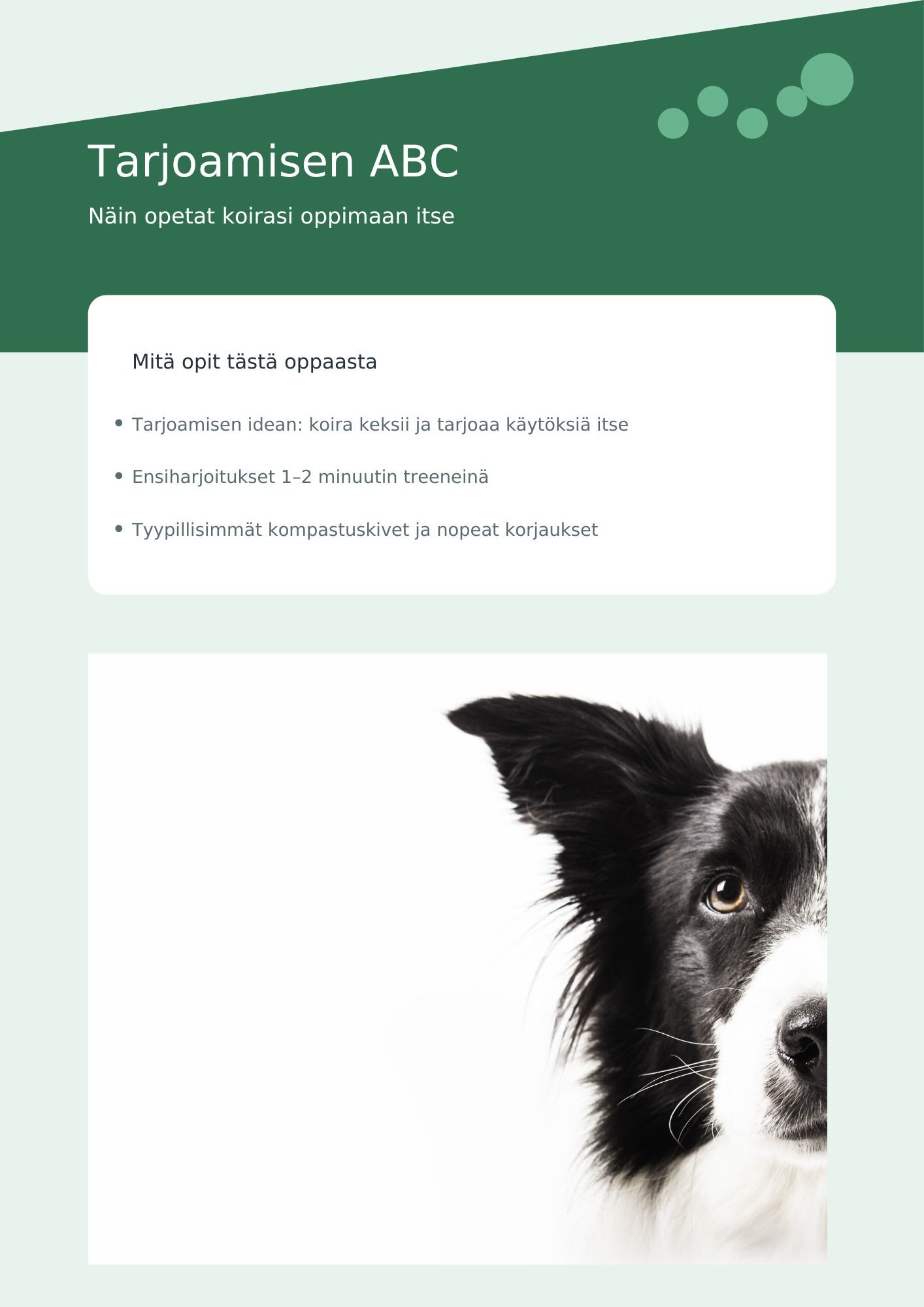Tarjoamisen ABC sopii kaikille koirakoille – pennuista aikuisempiin, harrastajista kotikoiriin. Kun koira oppii tarjoamisen idean, se muuttuu innokkaaksi oppijaksi, ja yhteinen tekeminen saa aivan uudenlaista syvyyttä.