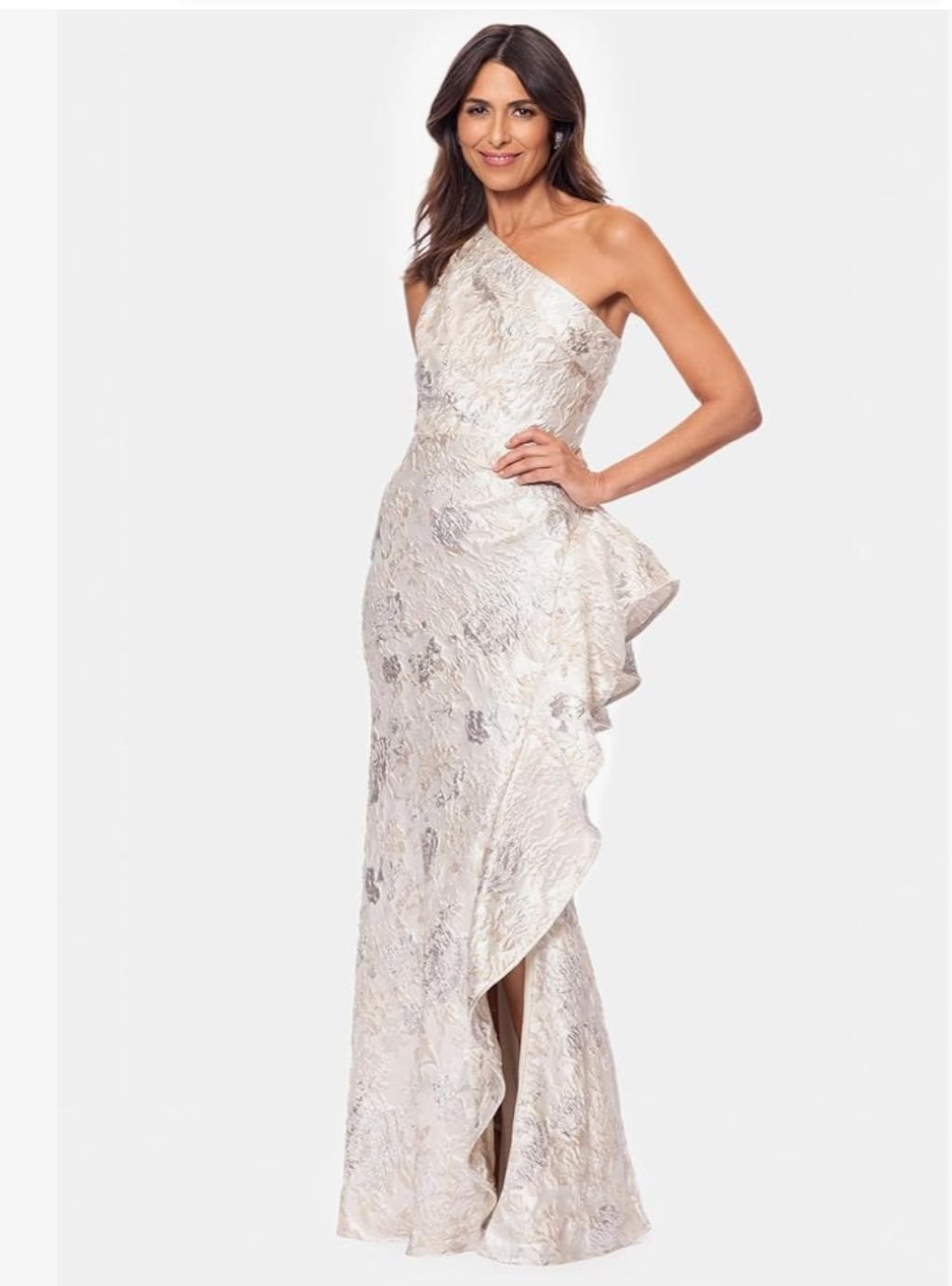 Xscape Women's One Shoulder Jaquard Side Ruffle Slit Gown