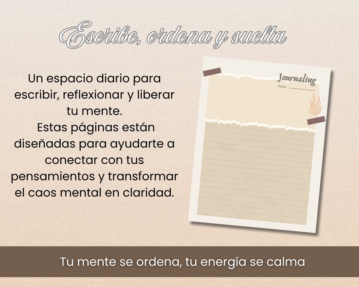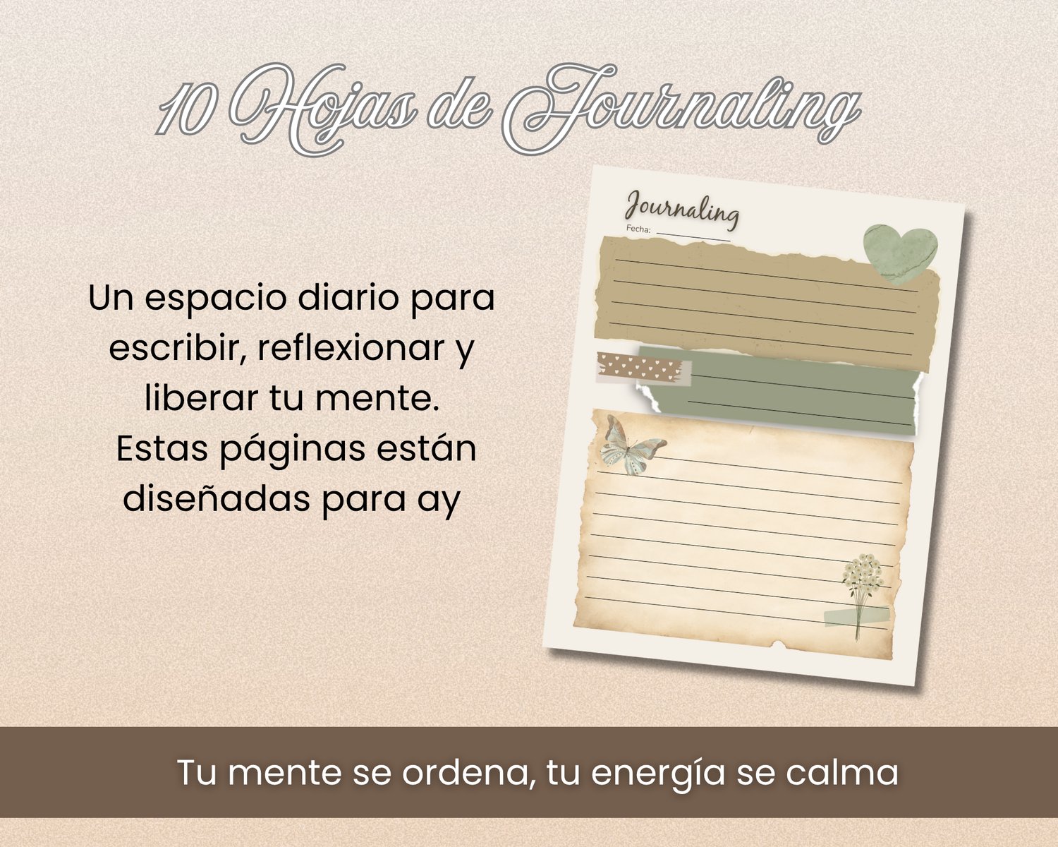 Estas 10 hojas de journaling han sido diseñadas para ayudarte a liberar pensamientos, emociones y preocupaciones, guiándote poco a poco hacia una sensación profunda de calma y equilibrio interior.