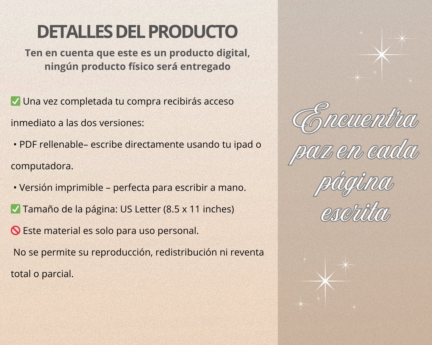 Cada página combina diseño minimalista y estética natural para inspirar tu práctica de escritura consciente. No necesitas ser experta: solo escribir lo que sientes y permitir que las palabras hagan su trabajo.