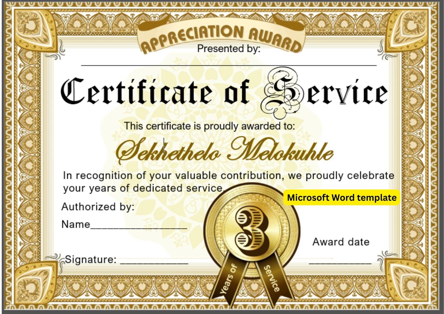 Mark a significant milestone in your employees' journey with our exclusive "03 Years of Service" digital certificate template for MS Word.