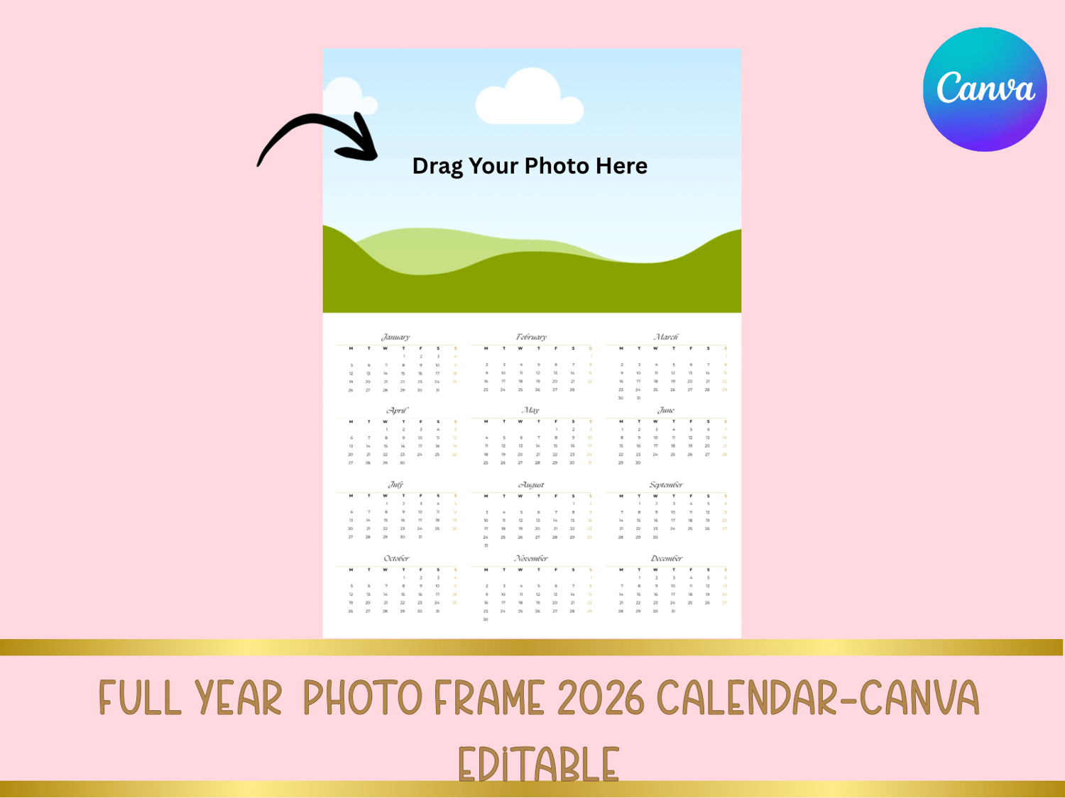 Full-Year 2026 Photo Frame Calendar – Canva Editable