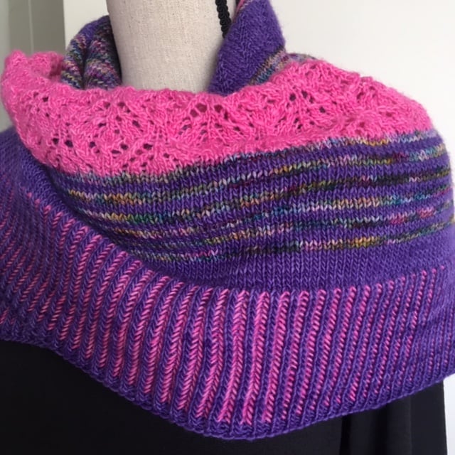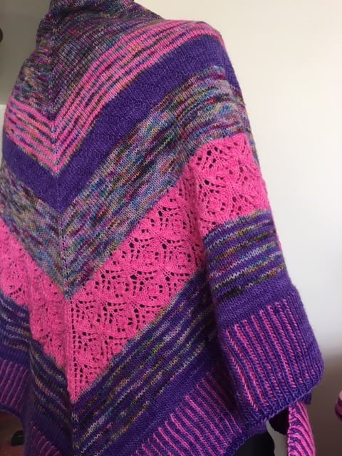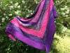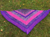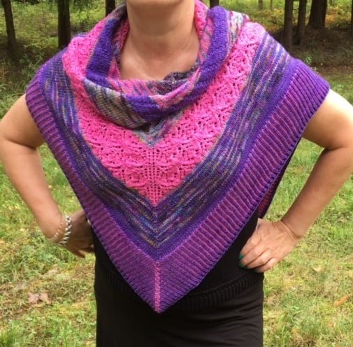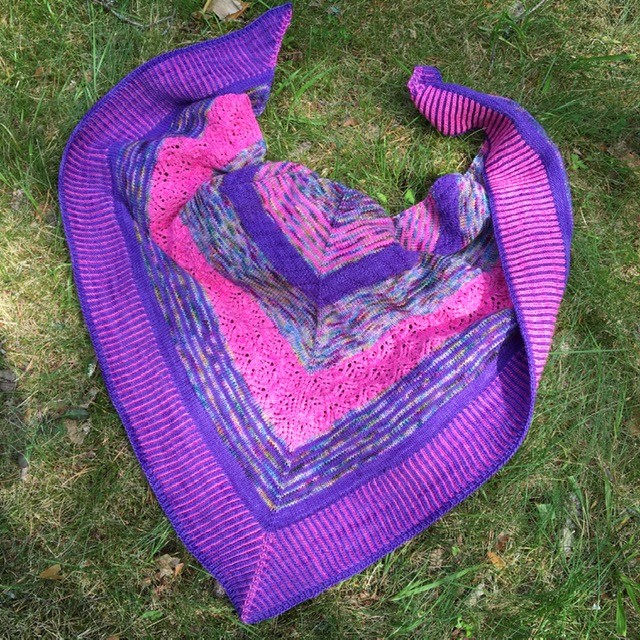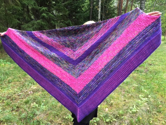 My inspiration for May Queen Shawl happened when I met the fabulous yarn and it got me under its spell. The multicolored May Queen colorway directly spoke to me. I could see it immediately combined with my favourite colors, pink and purple.