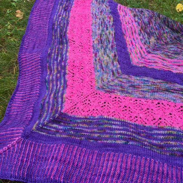 It features smooth stockinette and stripes, textured diagonal stripes of knits and purls, May flowers in a lace sequence and finally a colorful brioche border.