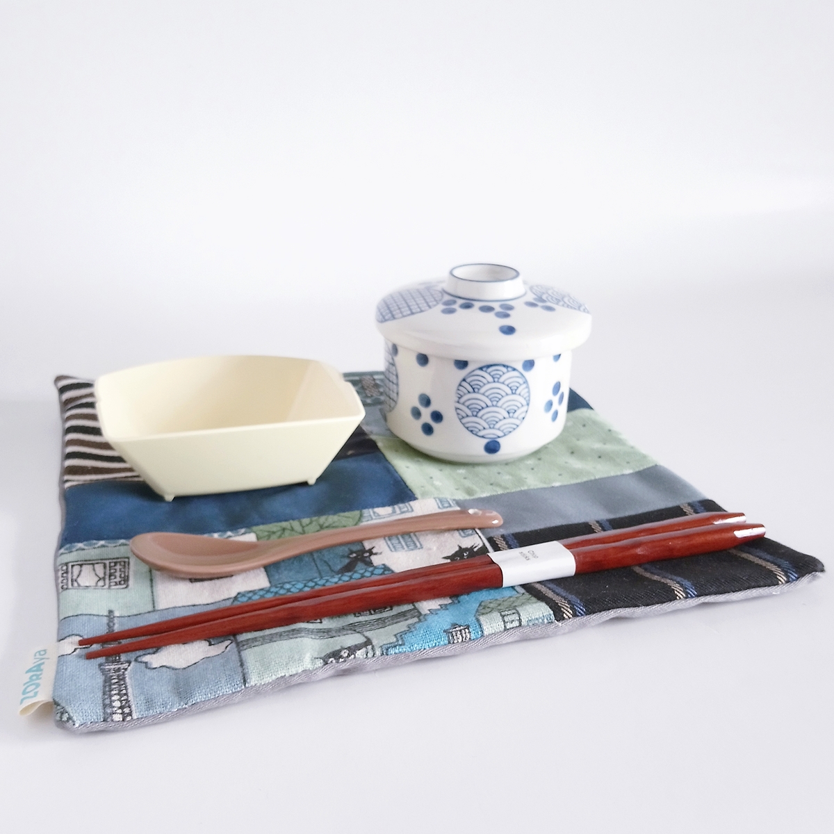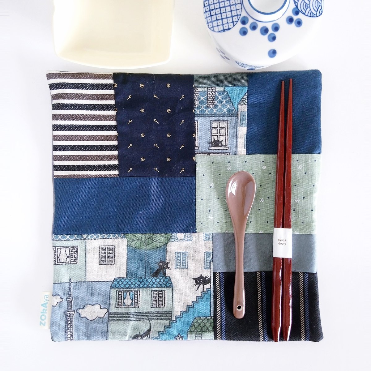 Square Patchwork Placemat (Cute Black Cats x Blue Green)