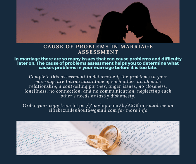 In marriage there are so many issues that can cause problems and difficulty later on. The cause of problems assessment helps you to determine what causes problems in your marriage before it is too late.